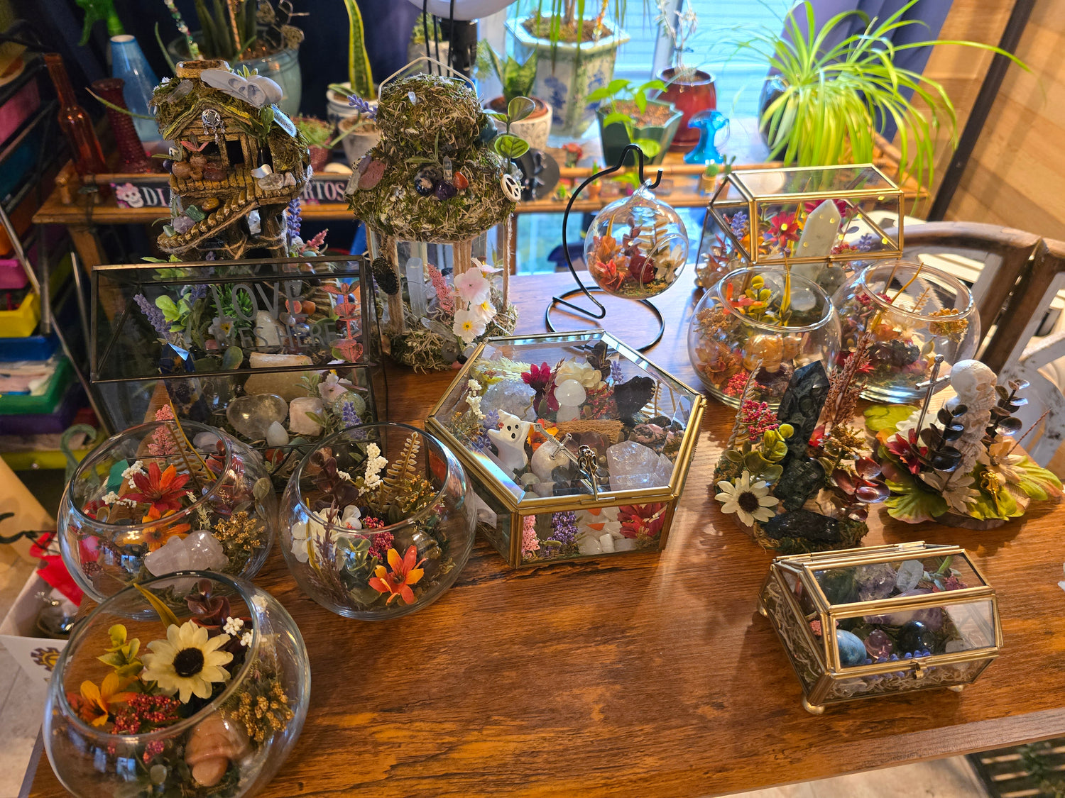 Unique terrarium style ecosystems housed in glass cases or atop unique mediums,...