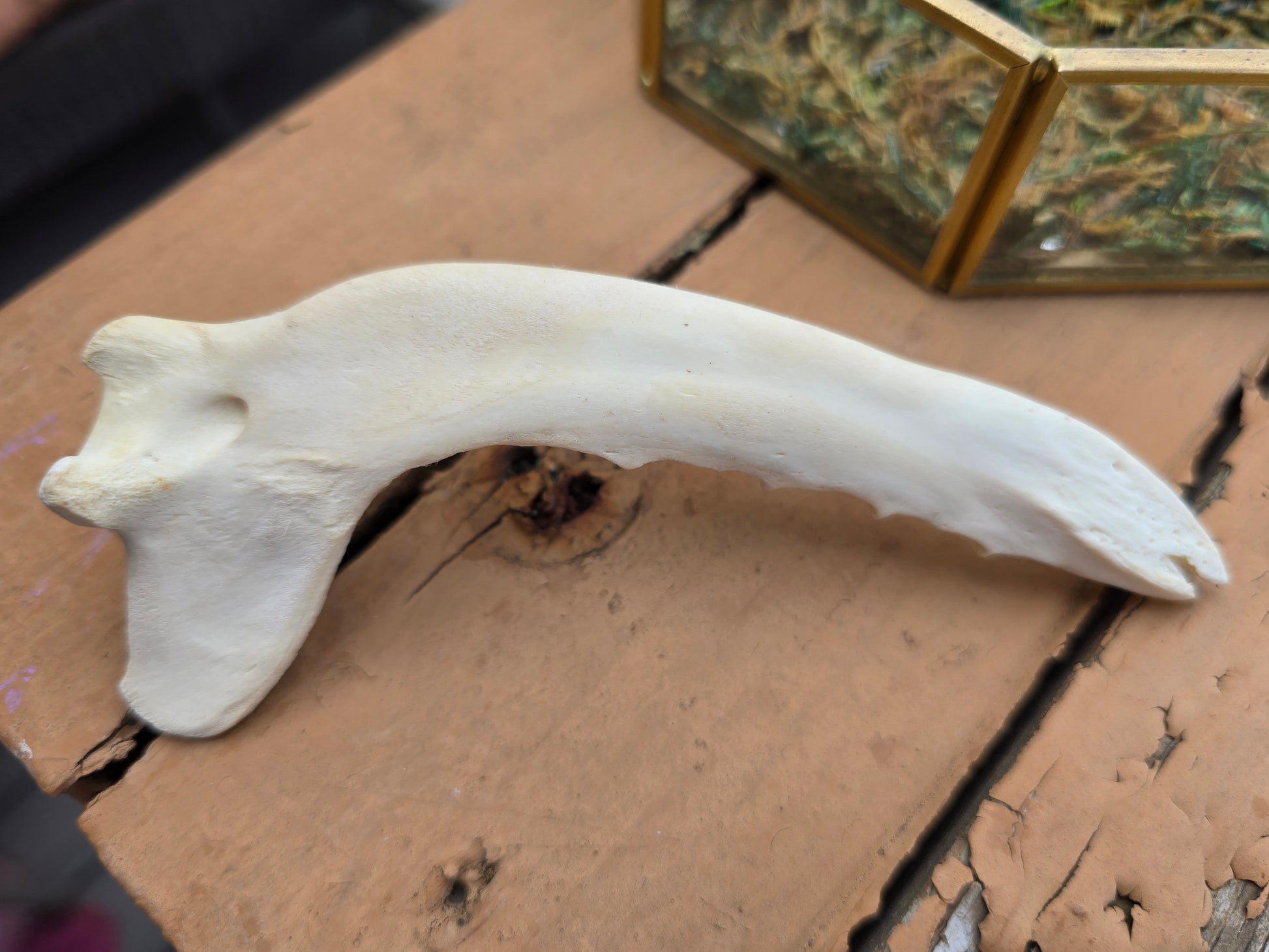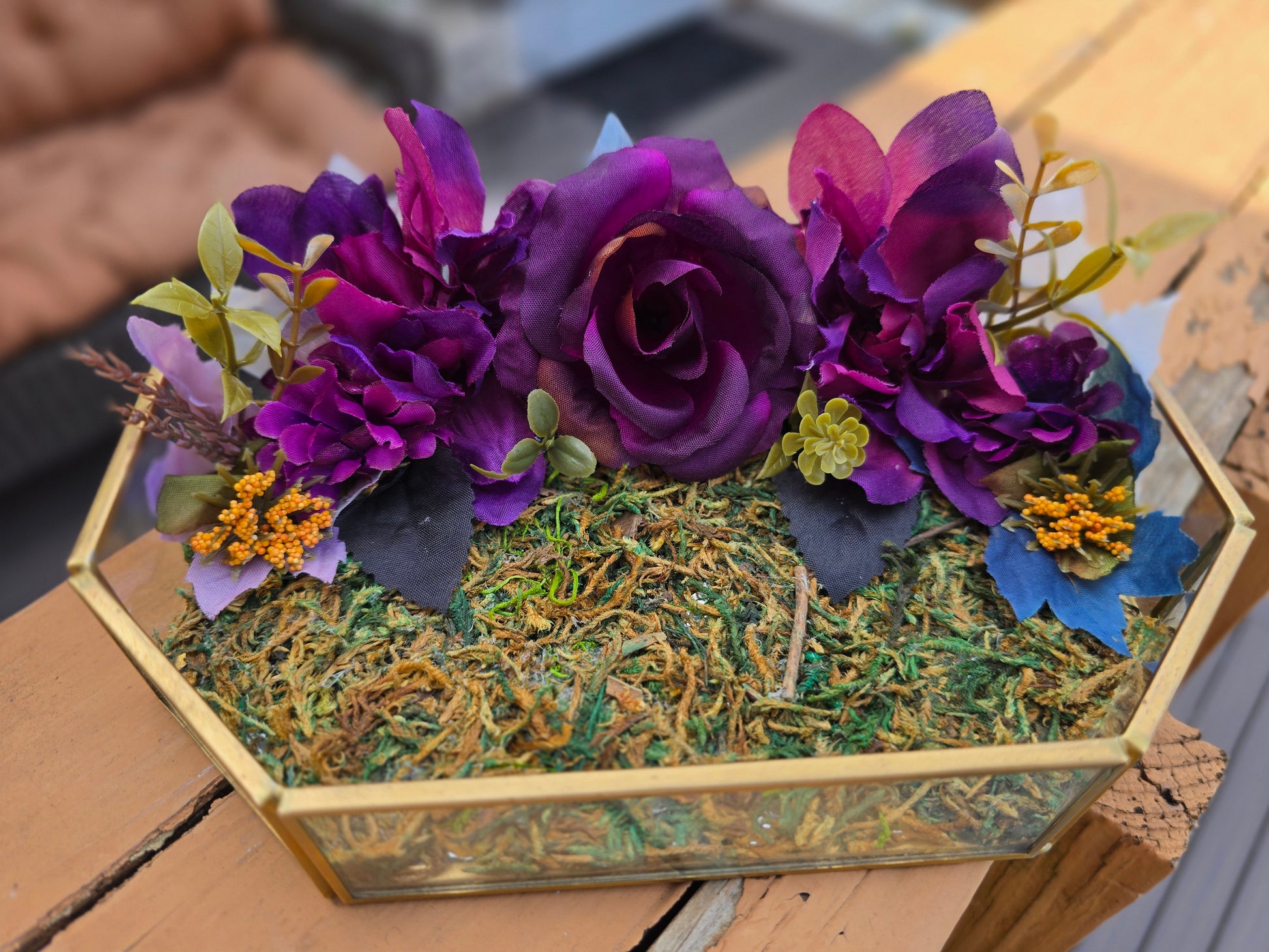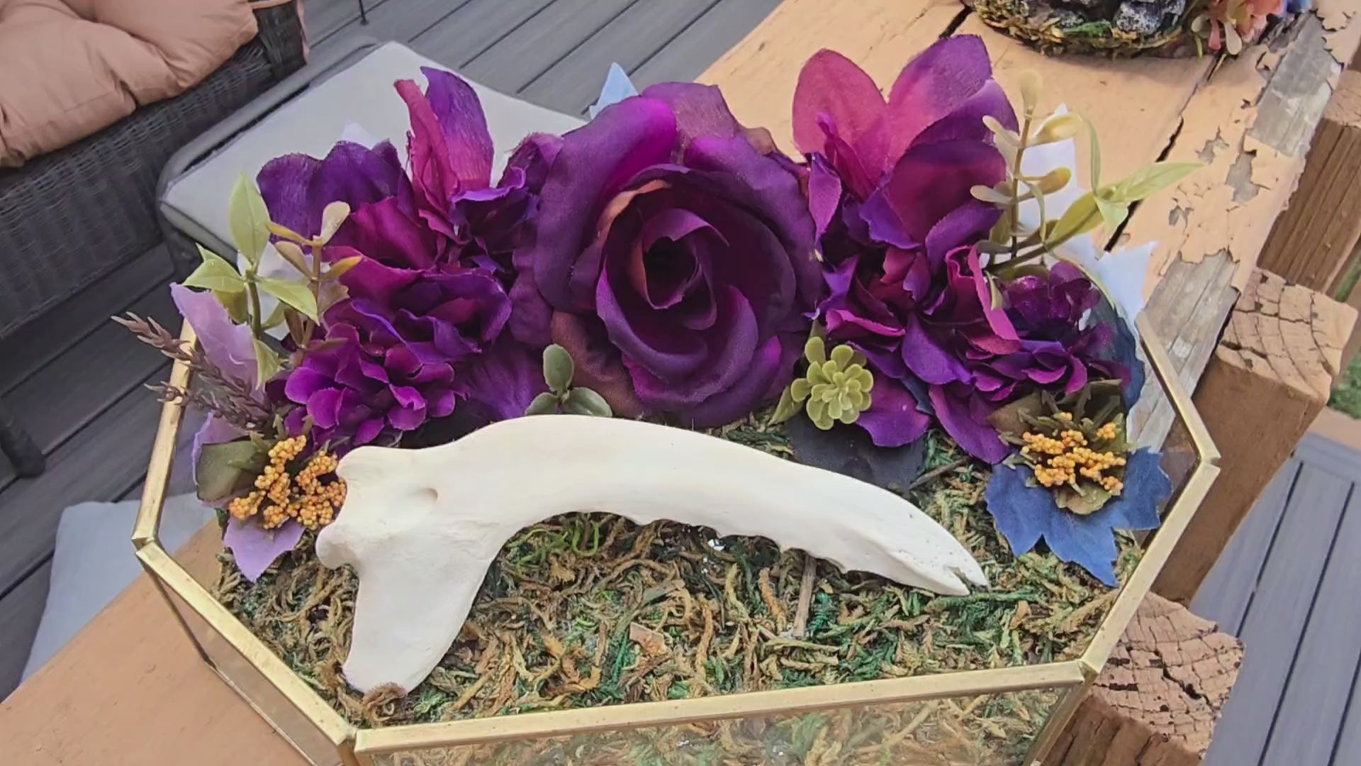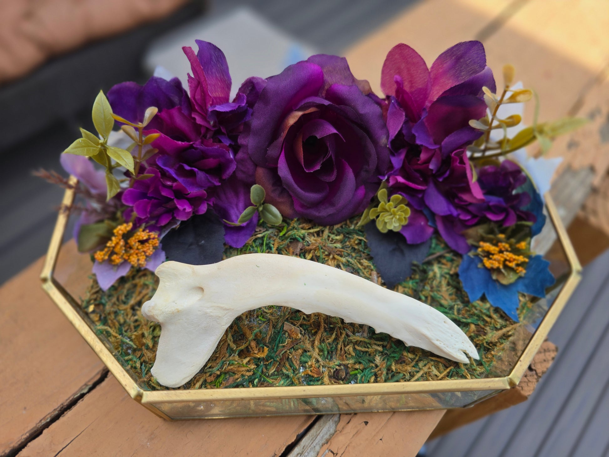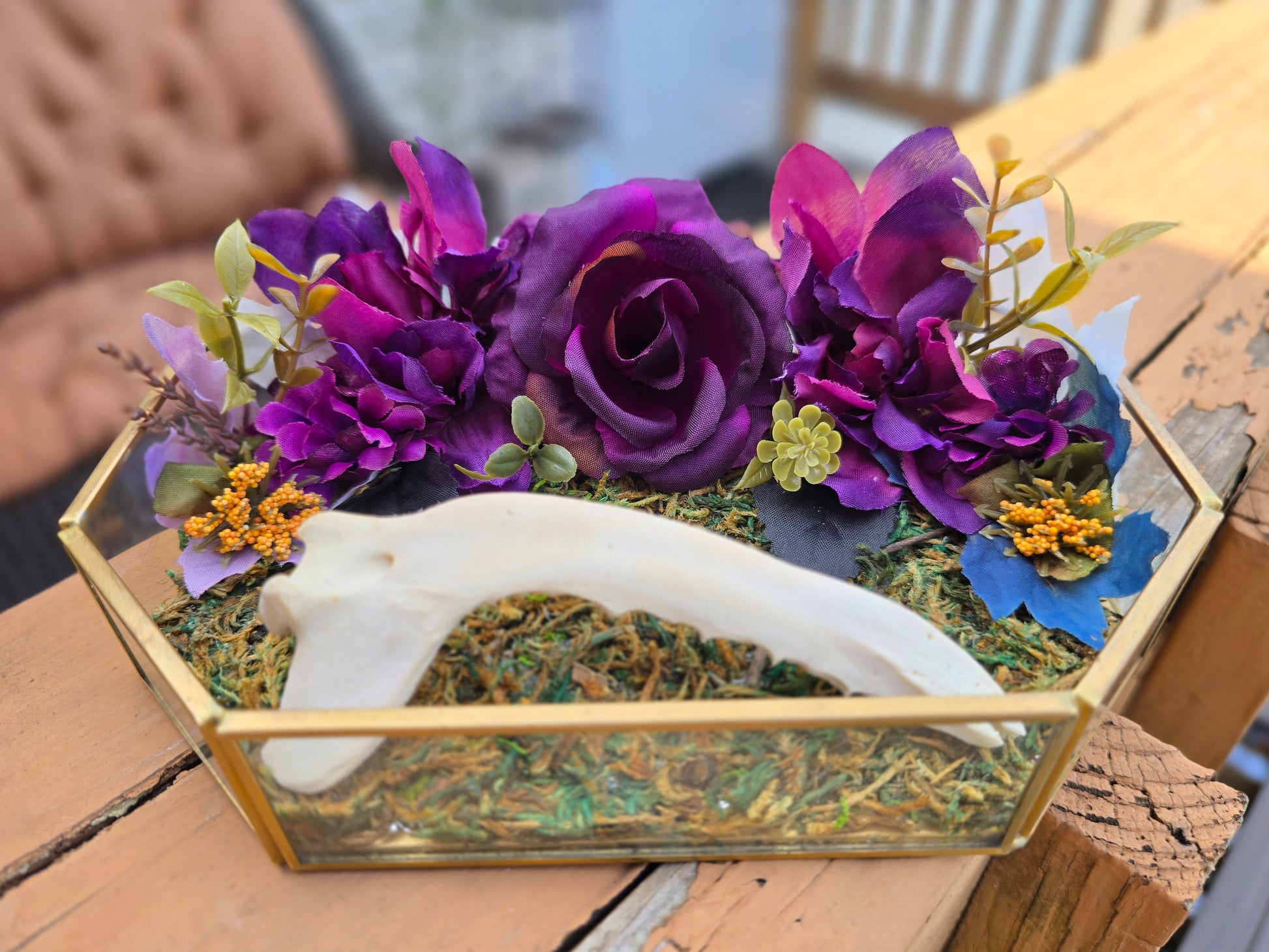 Experience the wild with Coyote Royale. This unique piece features a coyote jaw bone and deep purple flowers for a touch of nature. With a movable bone, you can display it exactly as you want. Unleash your wild side with Coyote Royale. Glass display tray with faux moss, foilage, and a 6" Coyote jaw bone.