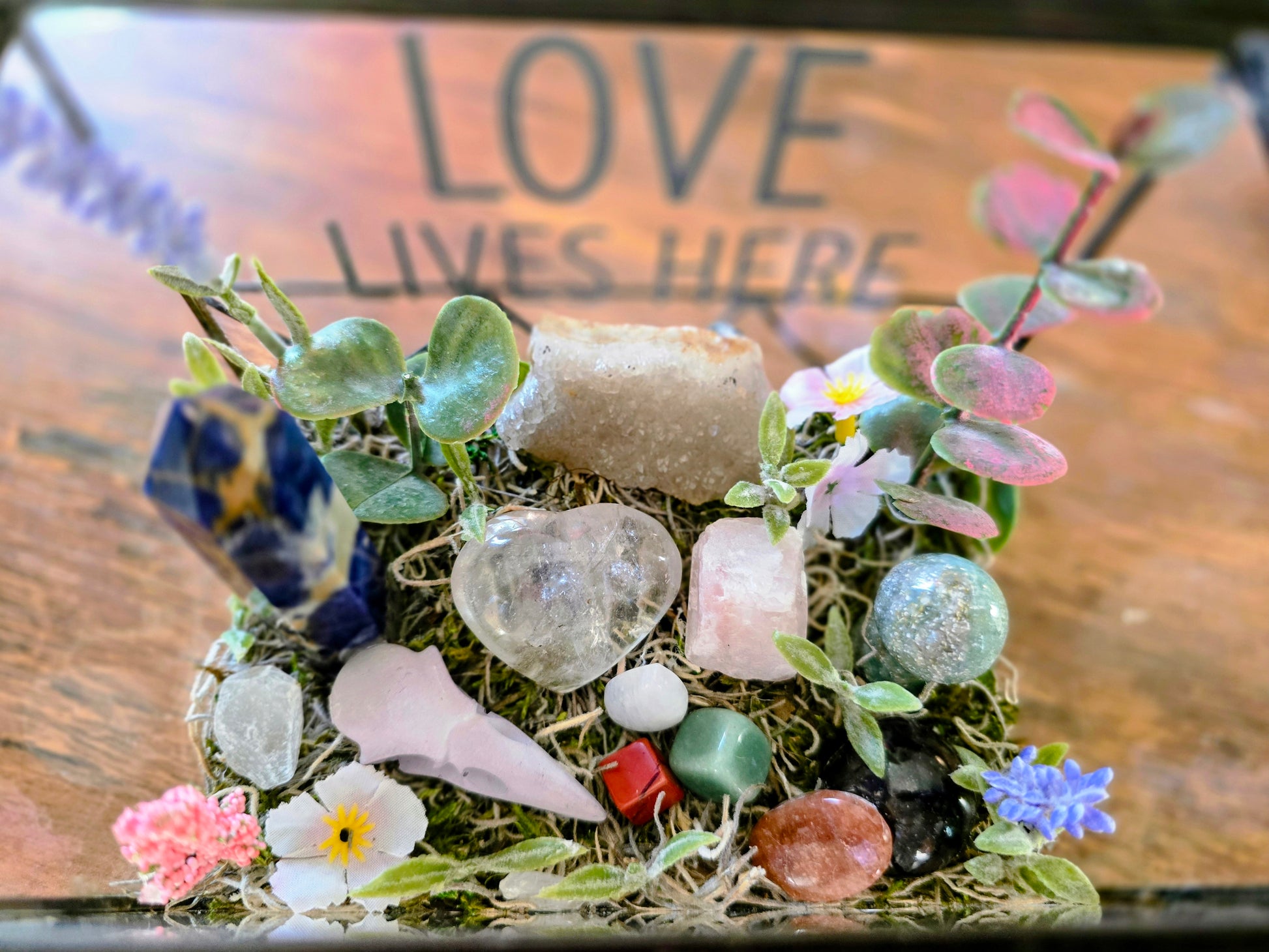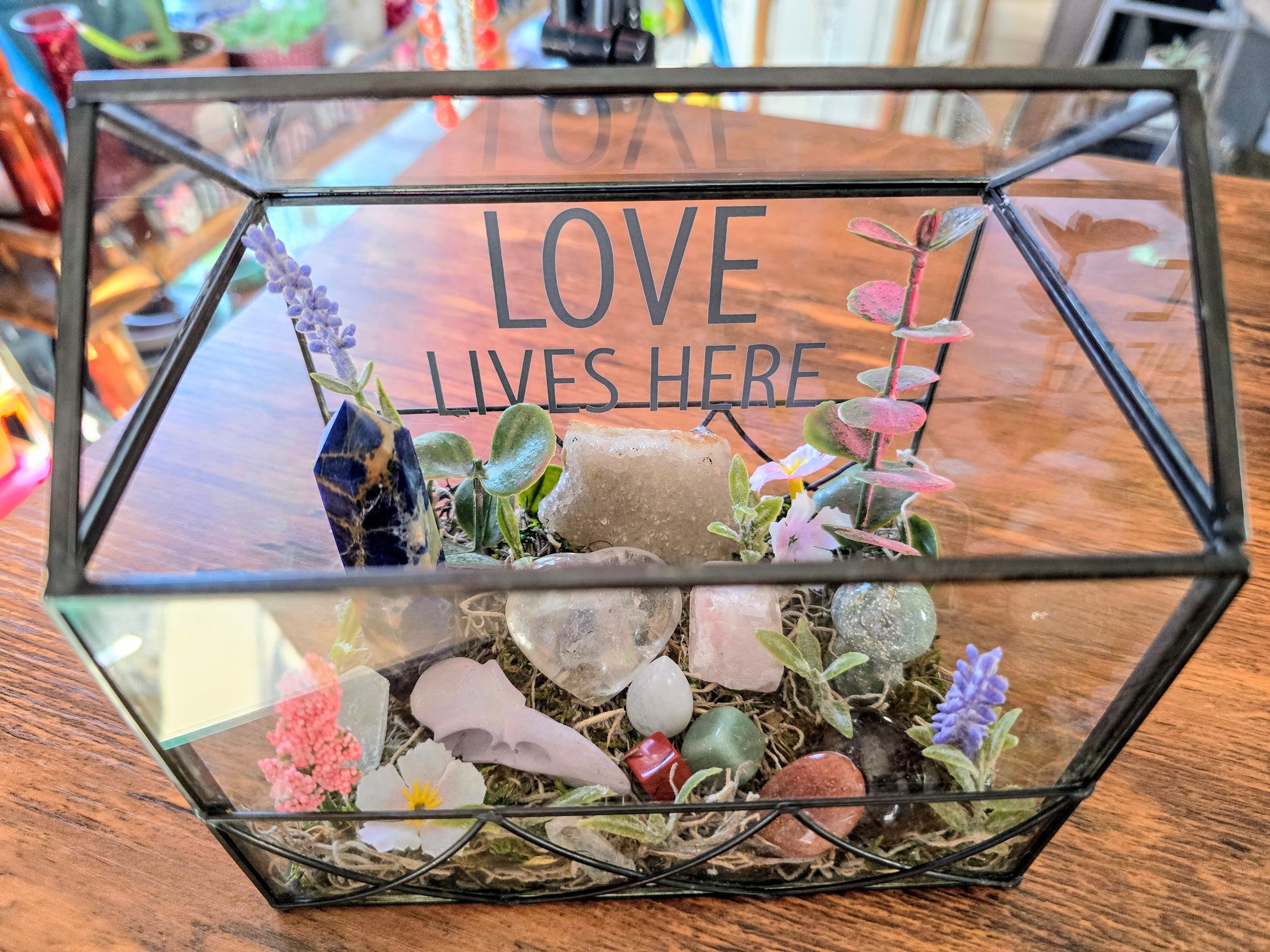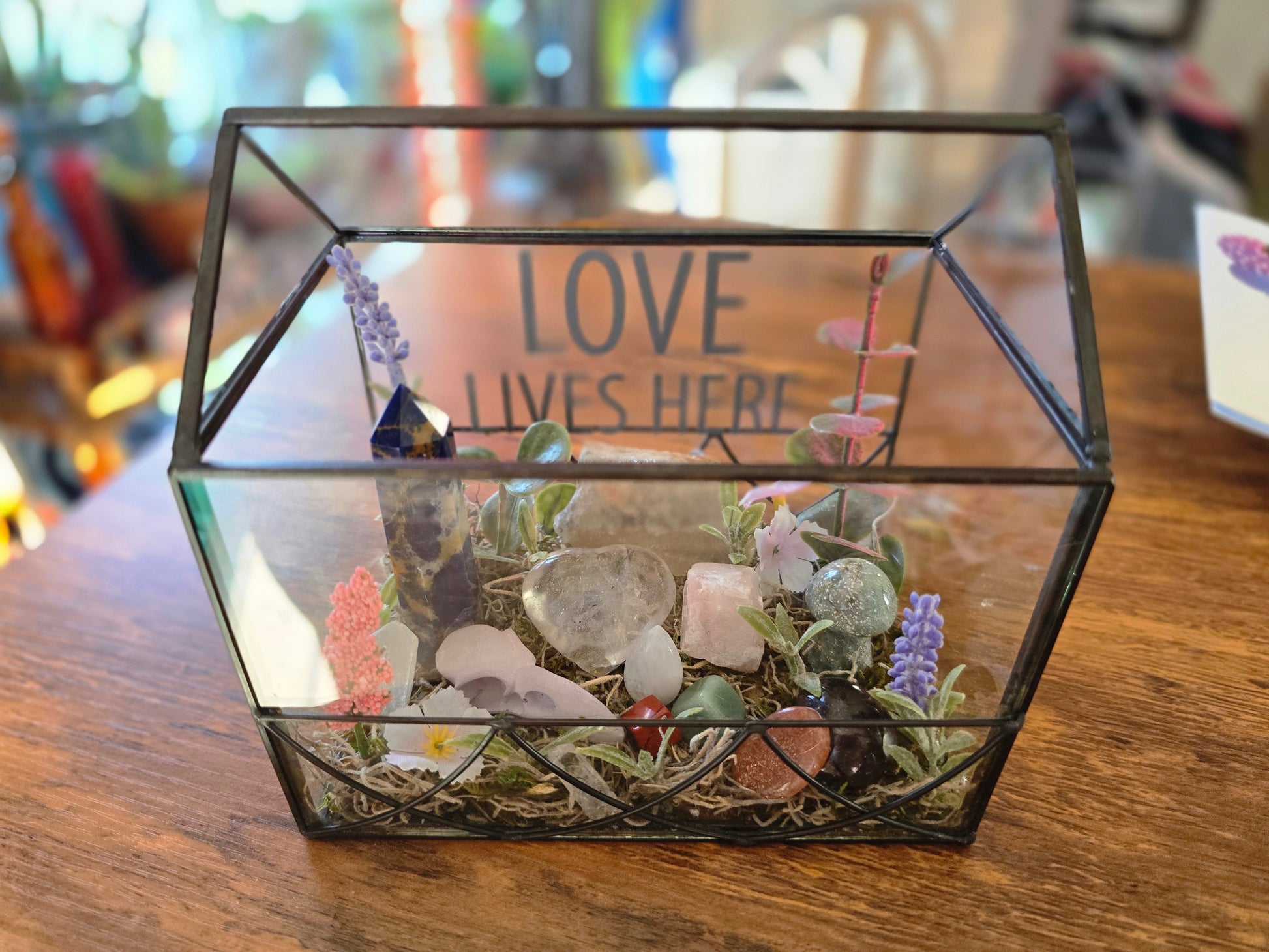 Add positive vibes to any space with Love Lives Here. Our house shaped terrarium contains healing crystals for a calming and grounding touch. Measuring 6"Hx6"Lx4"W, it's a unique and soothing addition to any room.