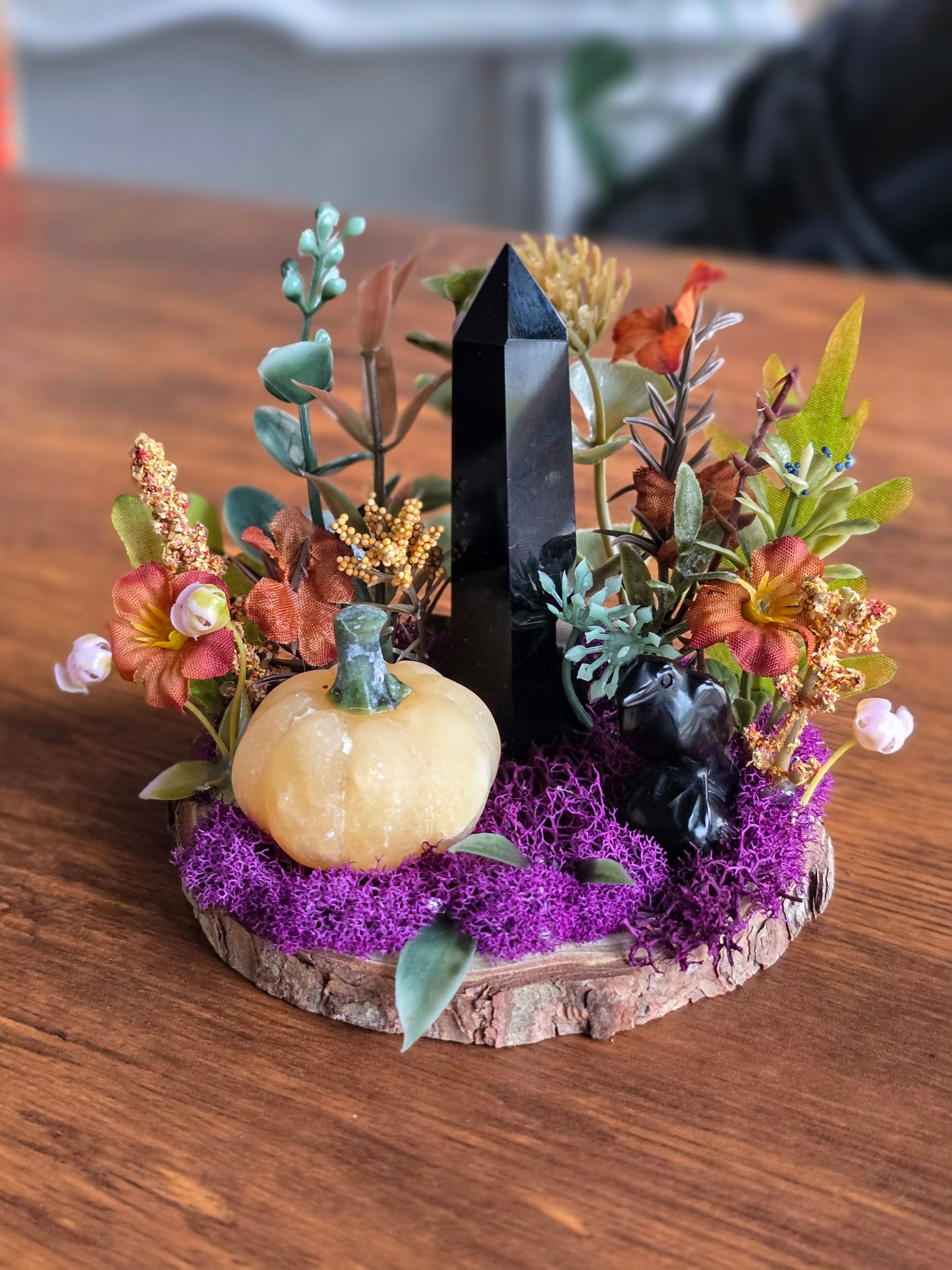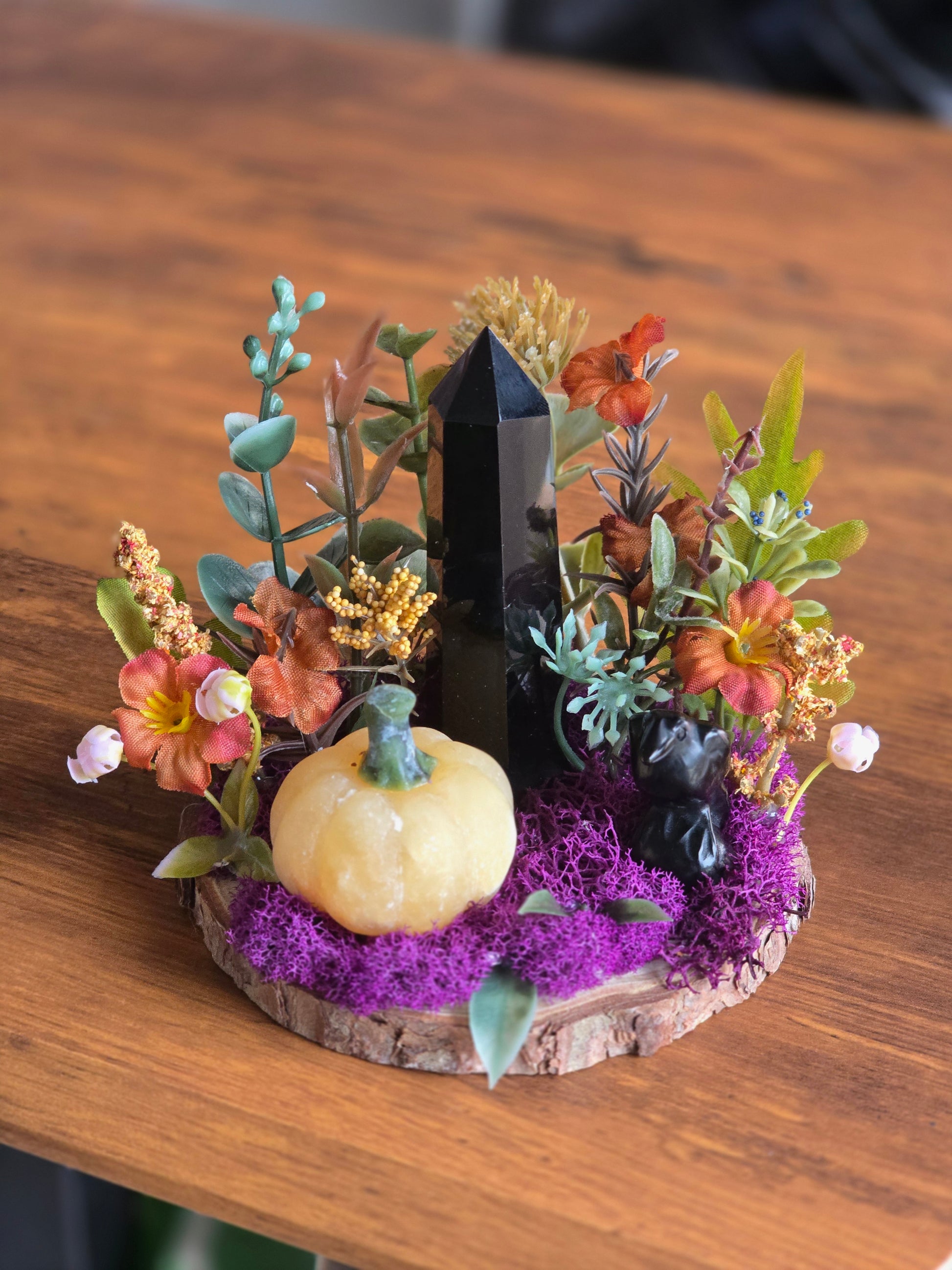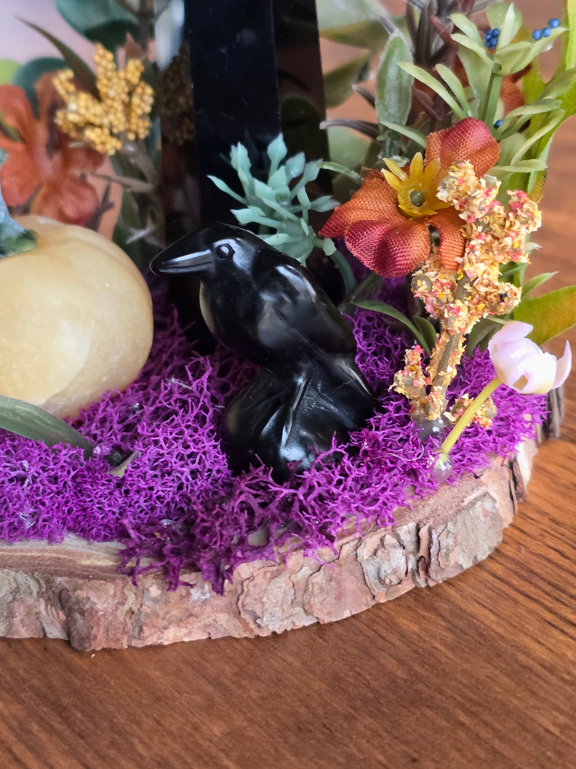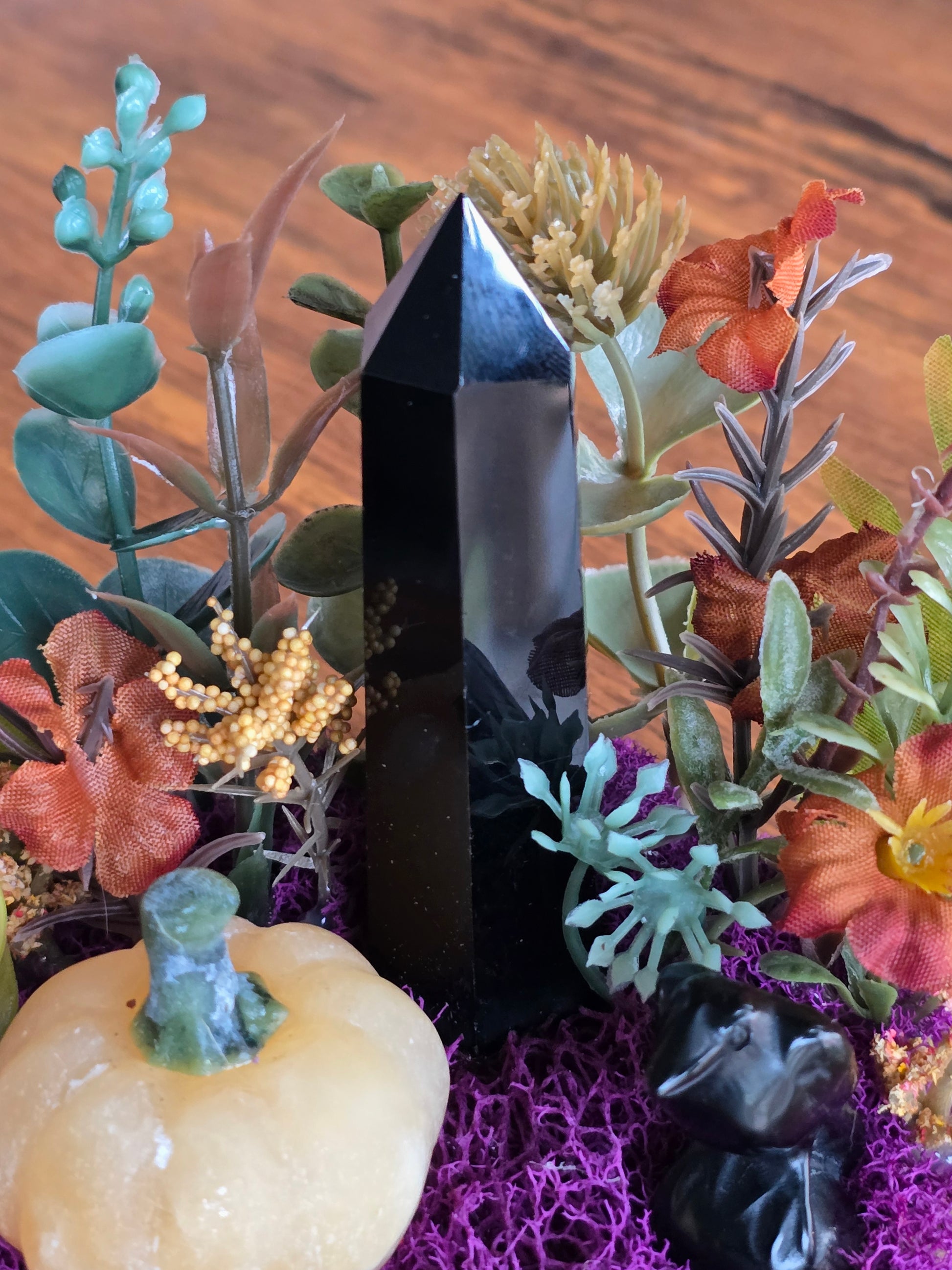 - Orange Calcite Pumpkin, Obsidian Raven and Tower.