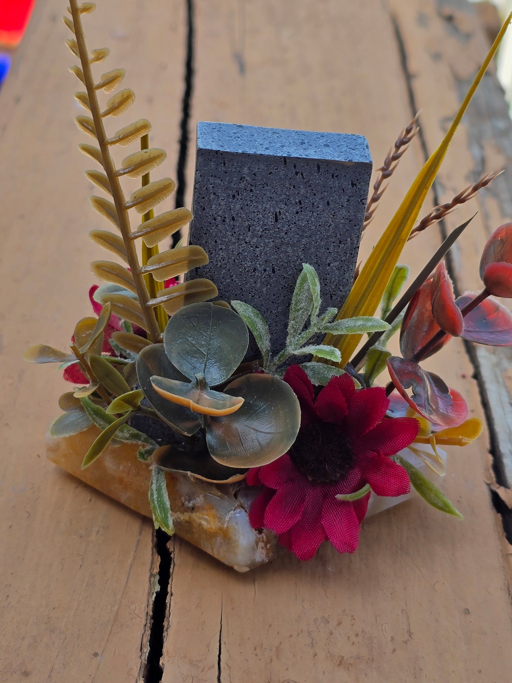 ✨️Small tombstone on Agate diamond with faux foilage and skull.