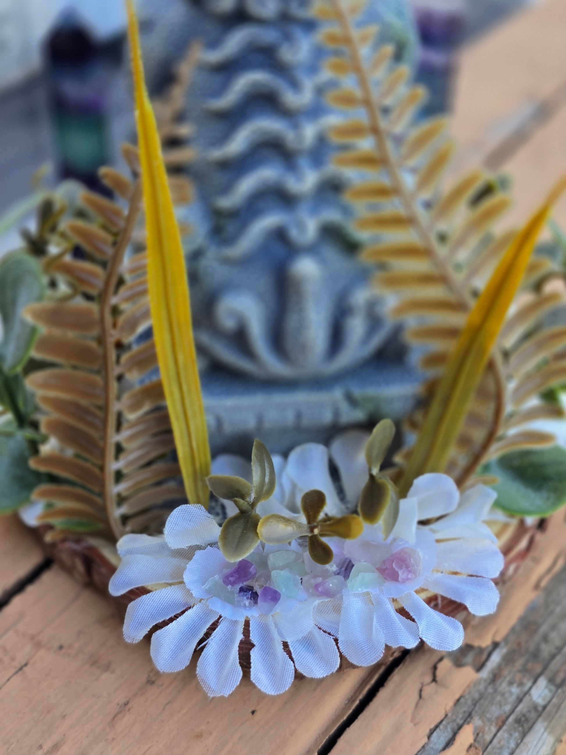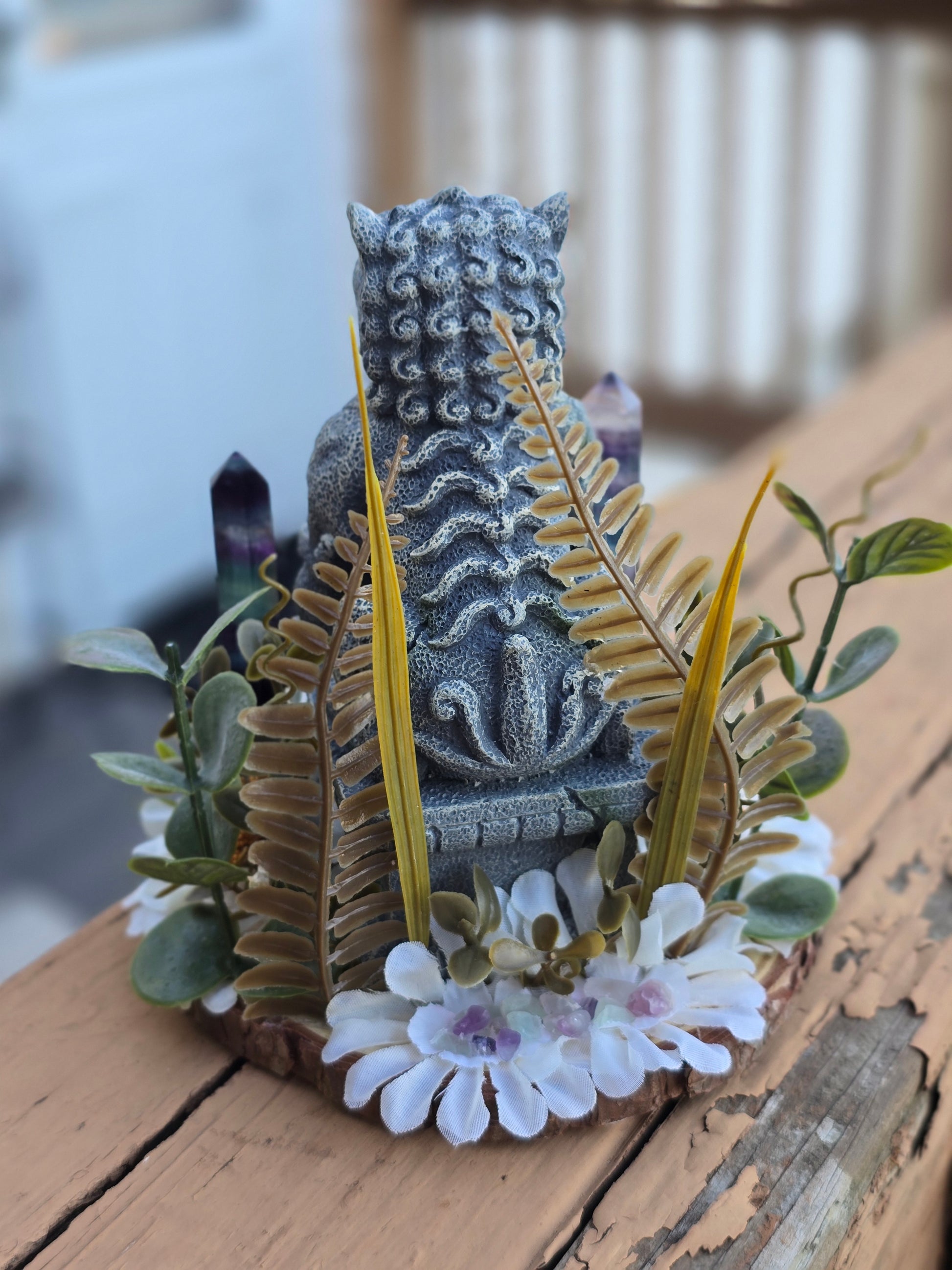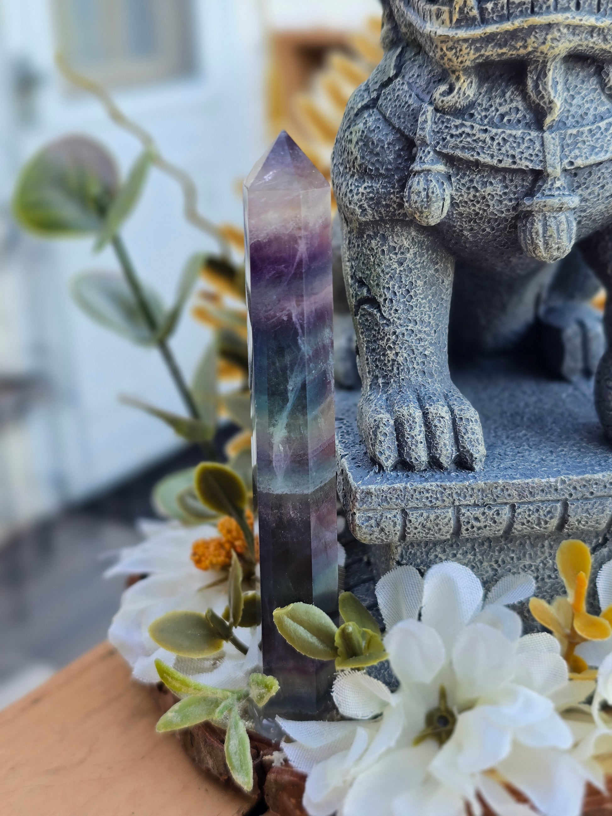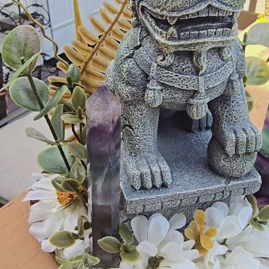 Guard your space with the Shishi Guardian. This Chinese lion dog guardian is combined with powerful fluorite towers to ward off negative energy and promote harmony. Add a unique touch to your decor while also inviting protection and balance into your home.