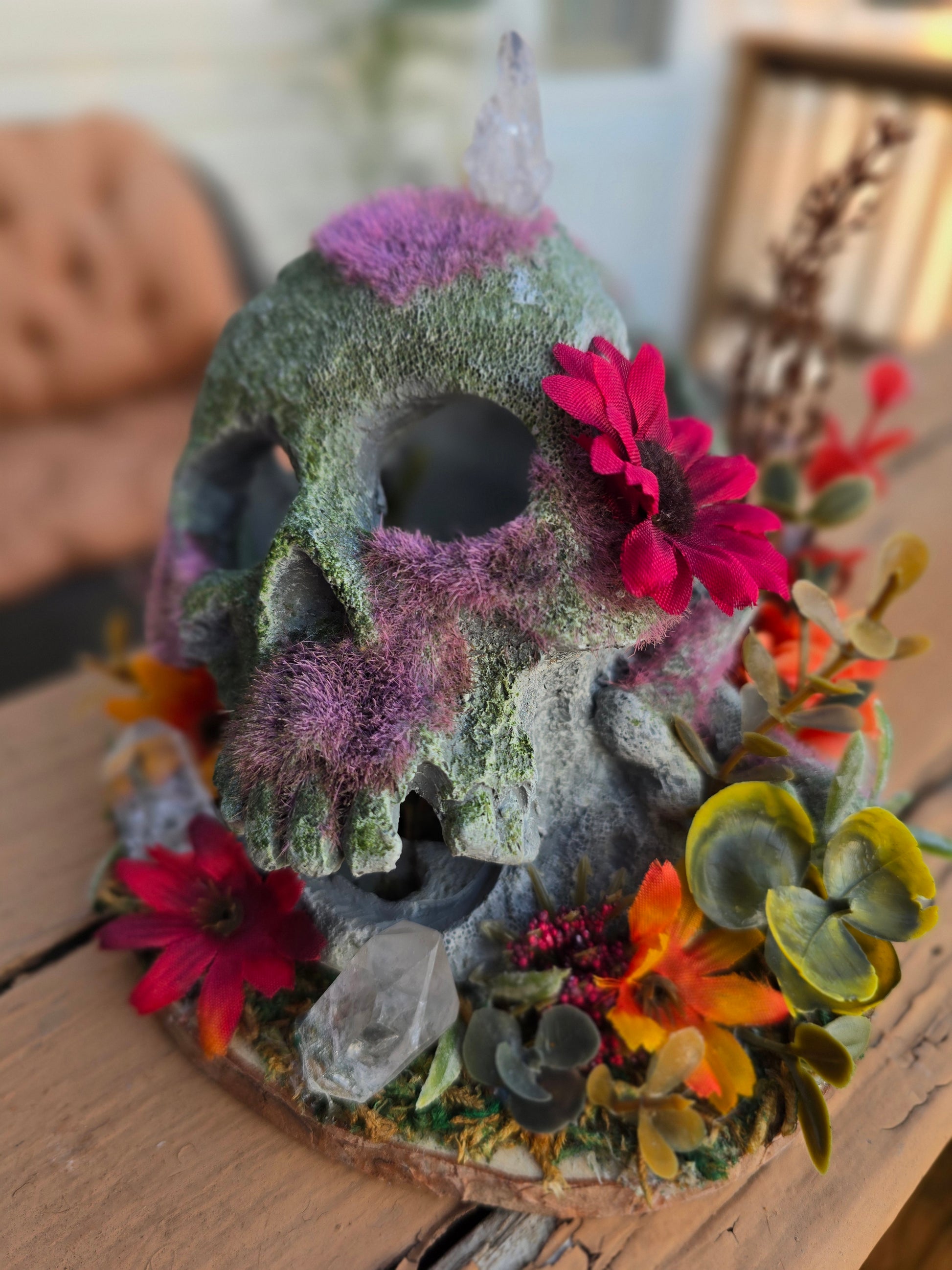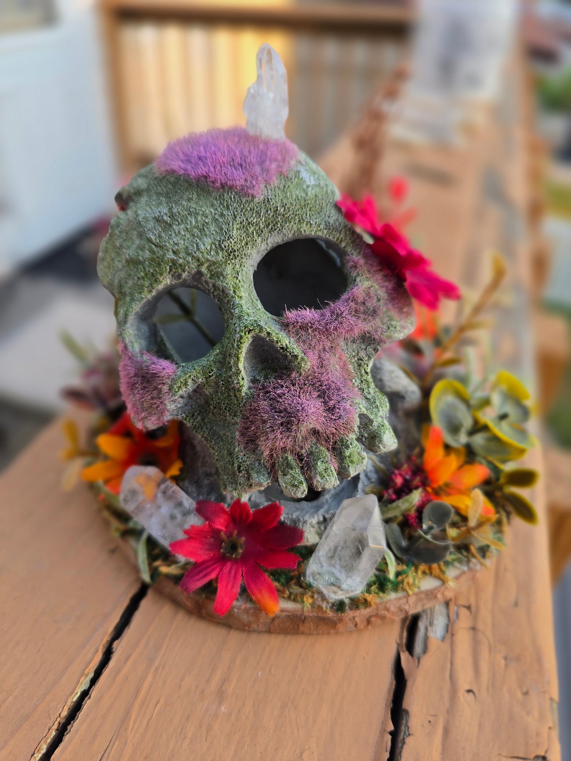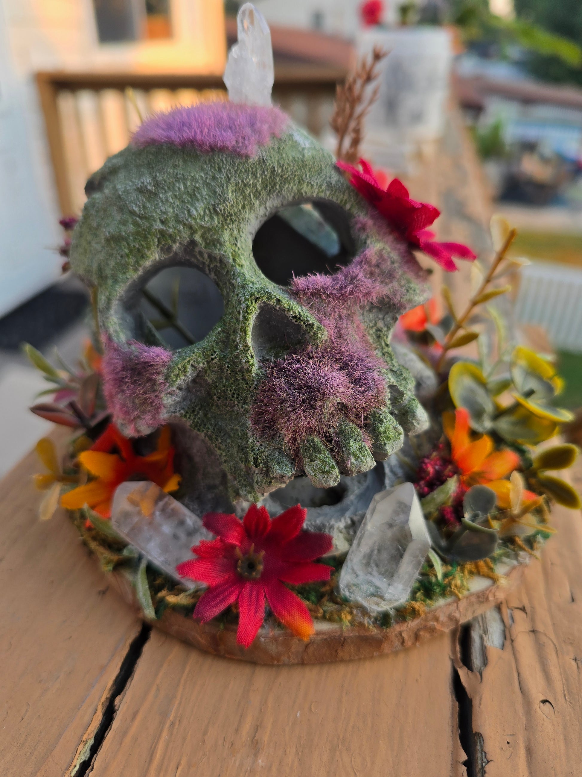 Discover the mystical allure of The Forgotten. Made with mossy skull, faux foliage, and clear Quartz crystal points for a unique and captivating aesthetic. Enhance your space with this one-of-a-kind piece and experience the power of natural elements.