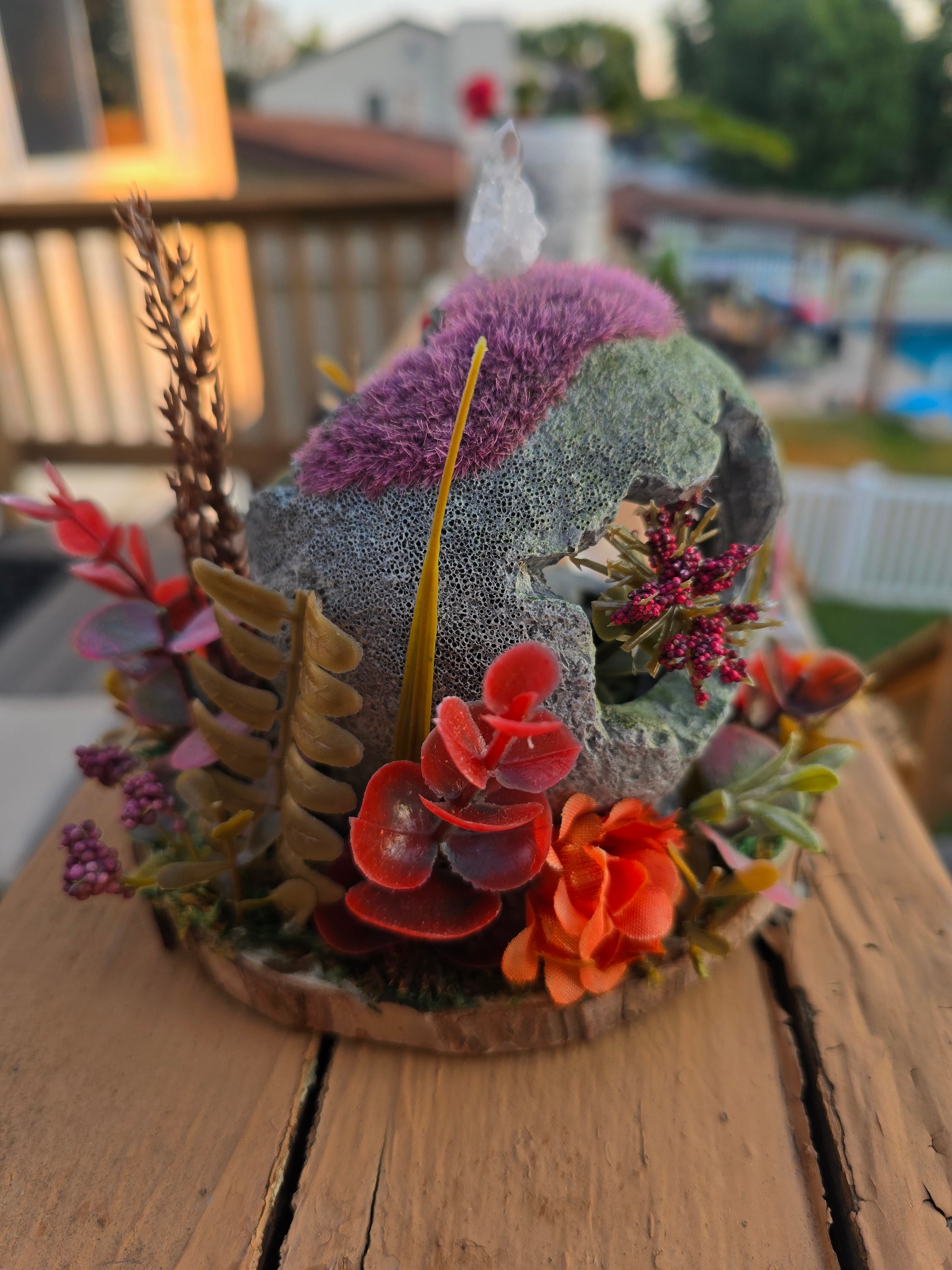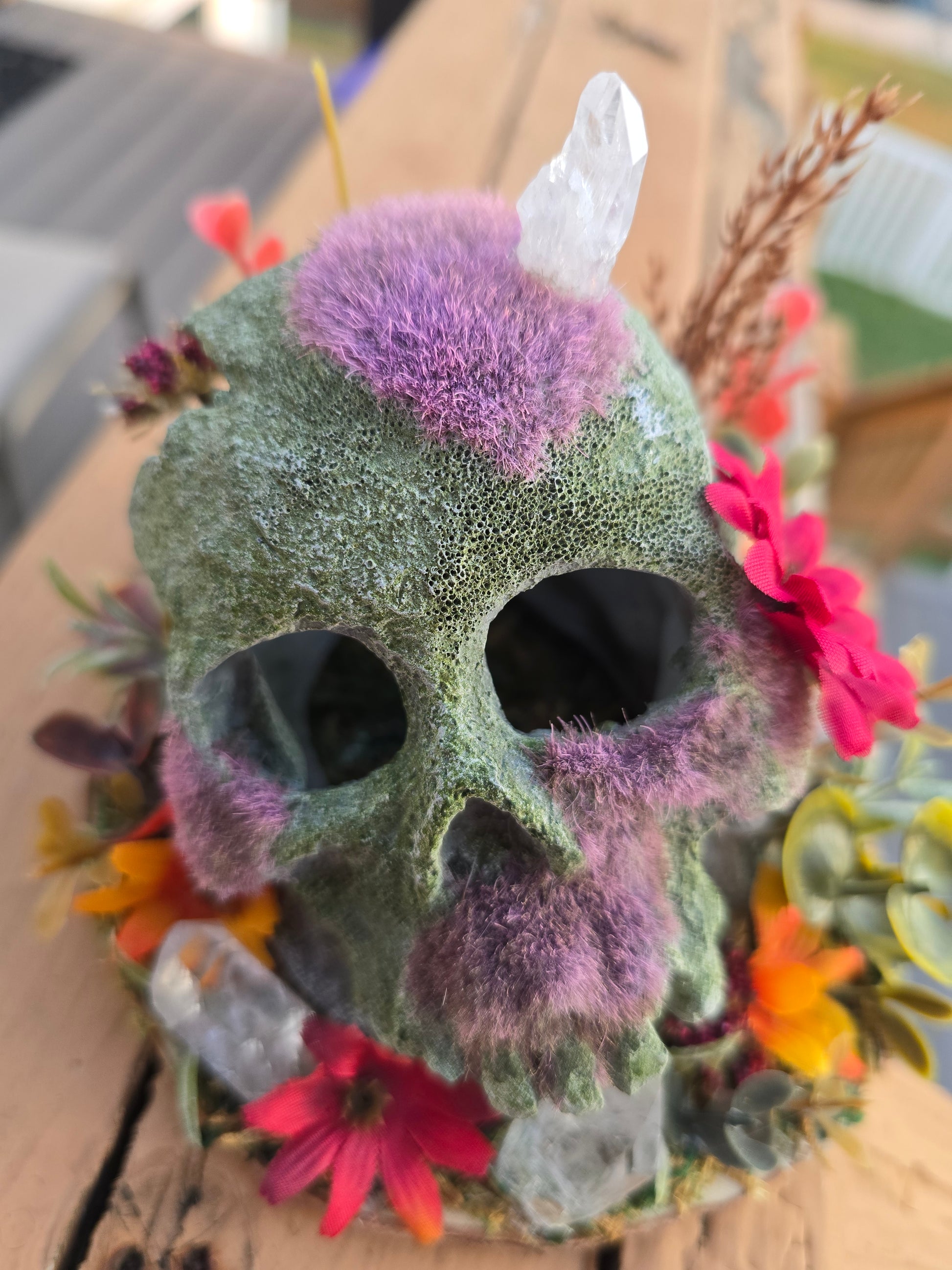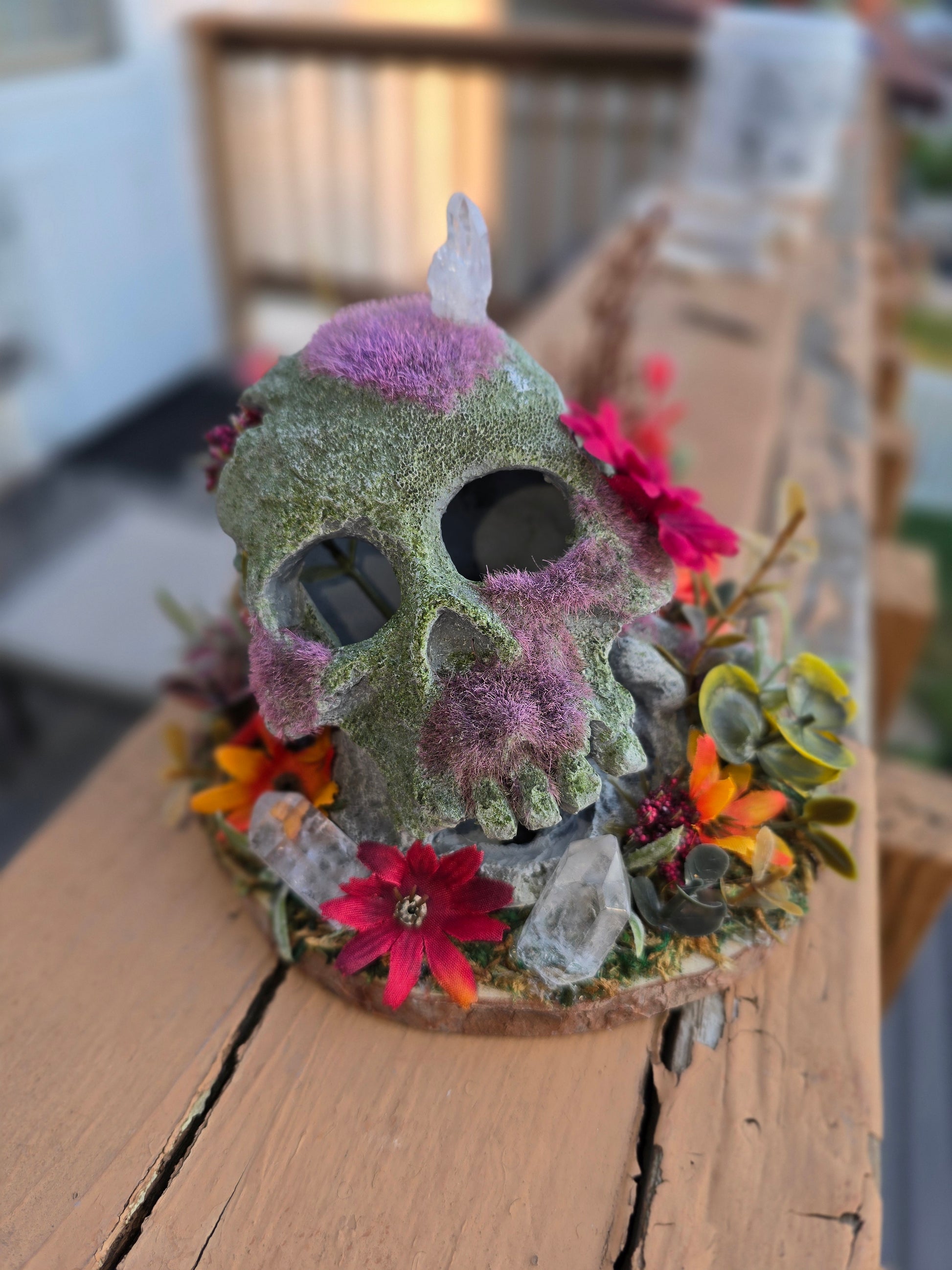 Discover the mystical allure of The Forgotten. Made with mossy skull, faux foliage, and clear Quartz crystal points for a unique and captivating aesthetic. Enhance your space with this one-of-a-kind piece and experience the power of natural elements.
