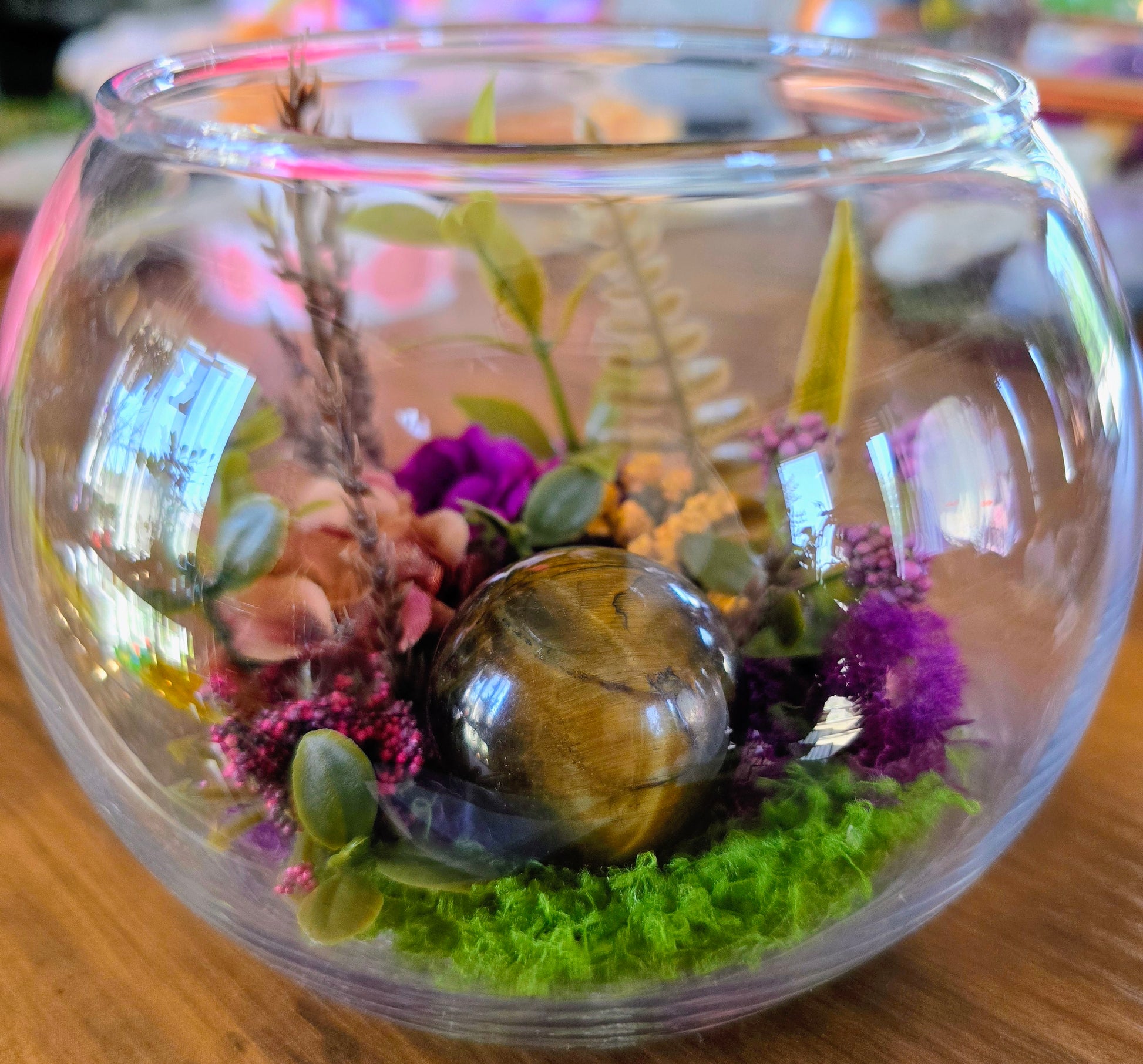 "Enhance your surroundings with this beautiful Tiger Eye Sphere. Measuring 1.5" in diameter, it's the perfect size to add a touch of positive energy to any room. Displayed in a 4" glass fishbowl with faux foliage, it adds a natural and calming element to your home or office."
