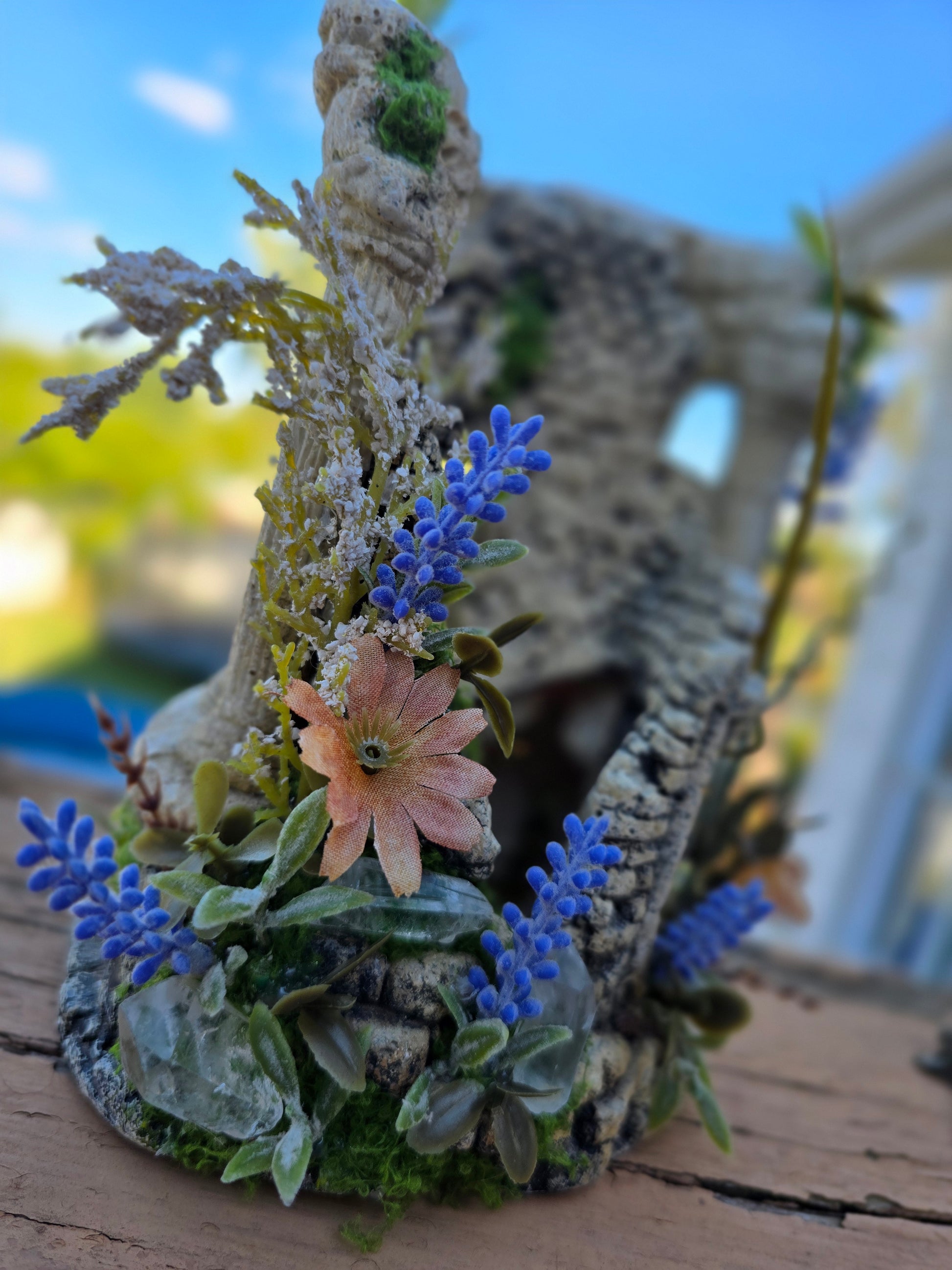 "The All In Ruins is a stunning resin castle ruin adorned with clear quartz points and faux foliage. Its versatility allows you to purchase it on its own or add a sphere to transform it into a crystal holder. Experience the beauty and energy of nature in this unique piece."