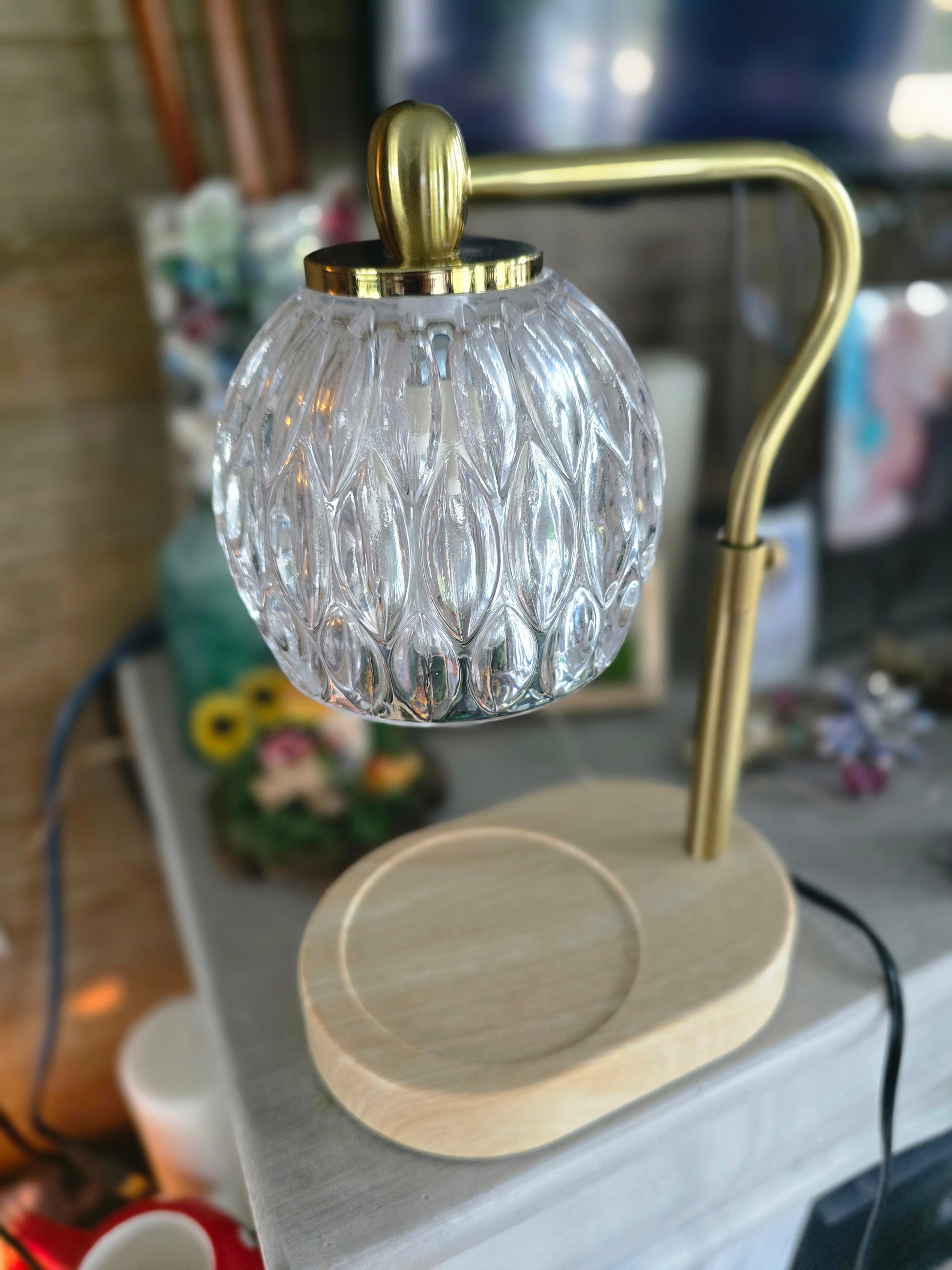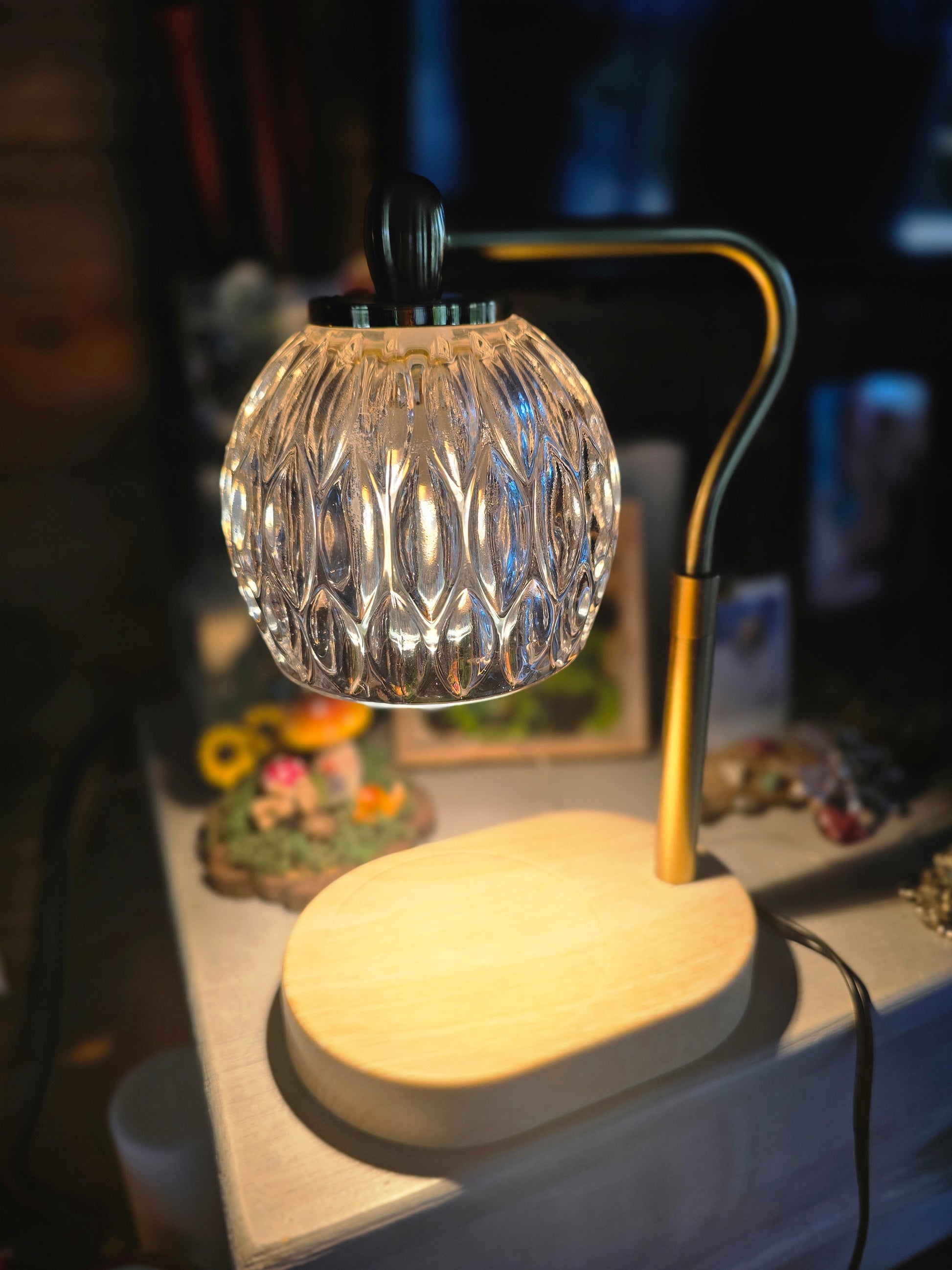 This Candle/Wax Warmer features an etched glass shade that gives off a warm, relaxing glow. The hot lamp efficiently melts wax or warms scented oils, filling your space with a comforting aroma. Perfect for creating a cozy ambiance in any room.