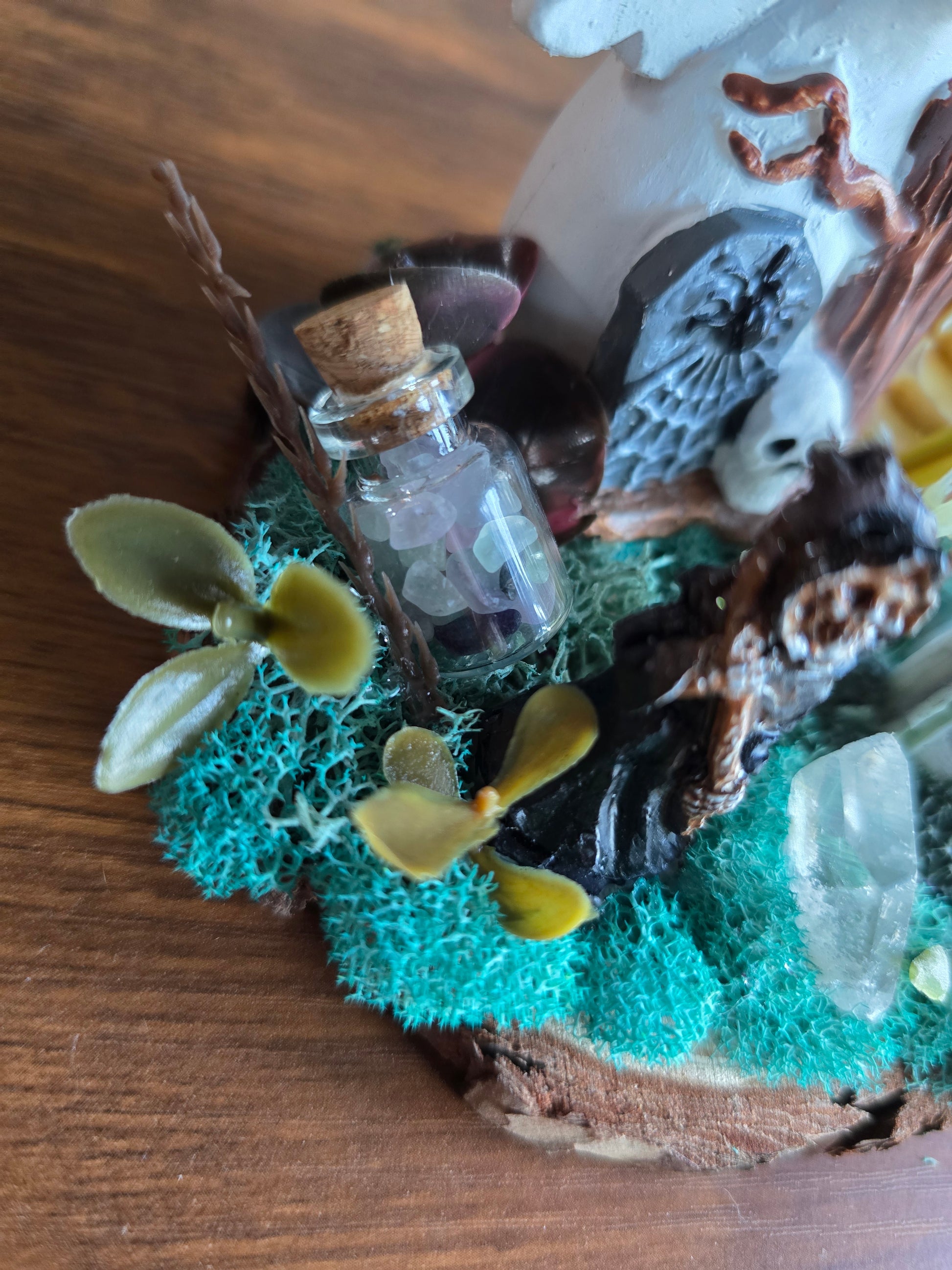 Resin spooky figures with faux moss and foilage, genuine clear quartz point, White Jade point, and mini bottle of Fluorite.
