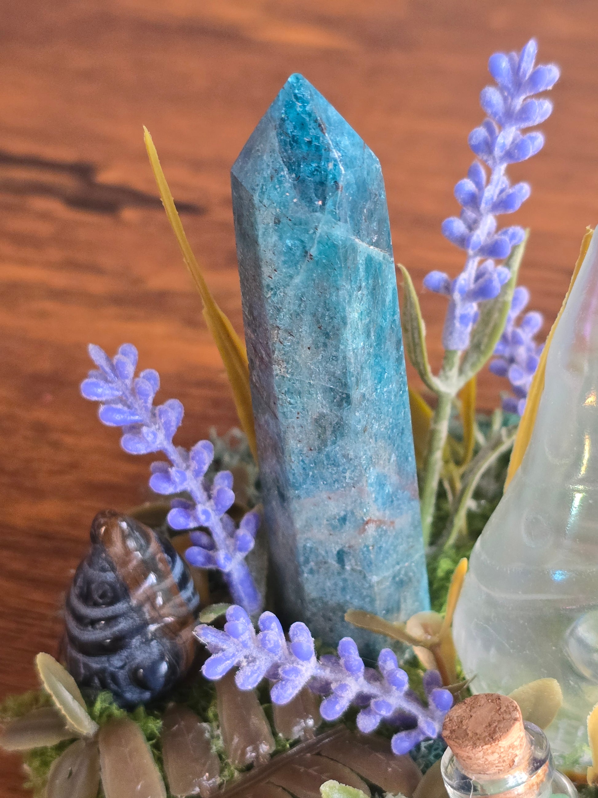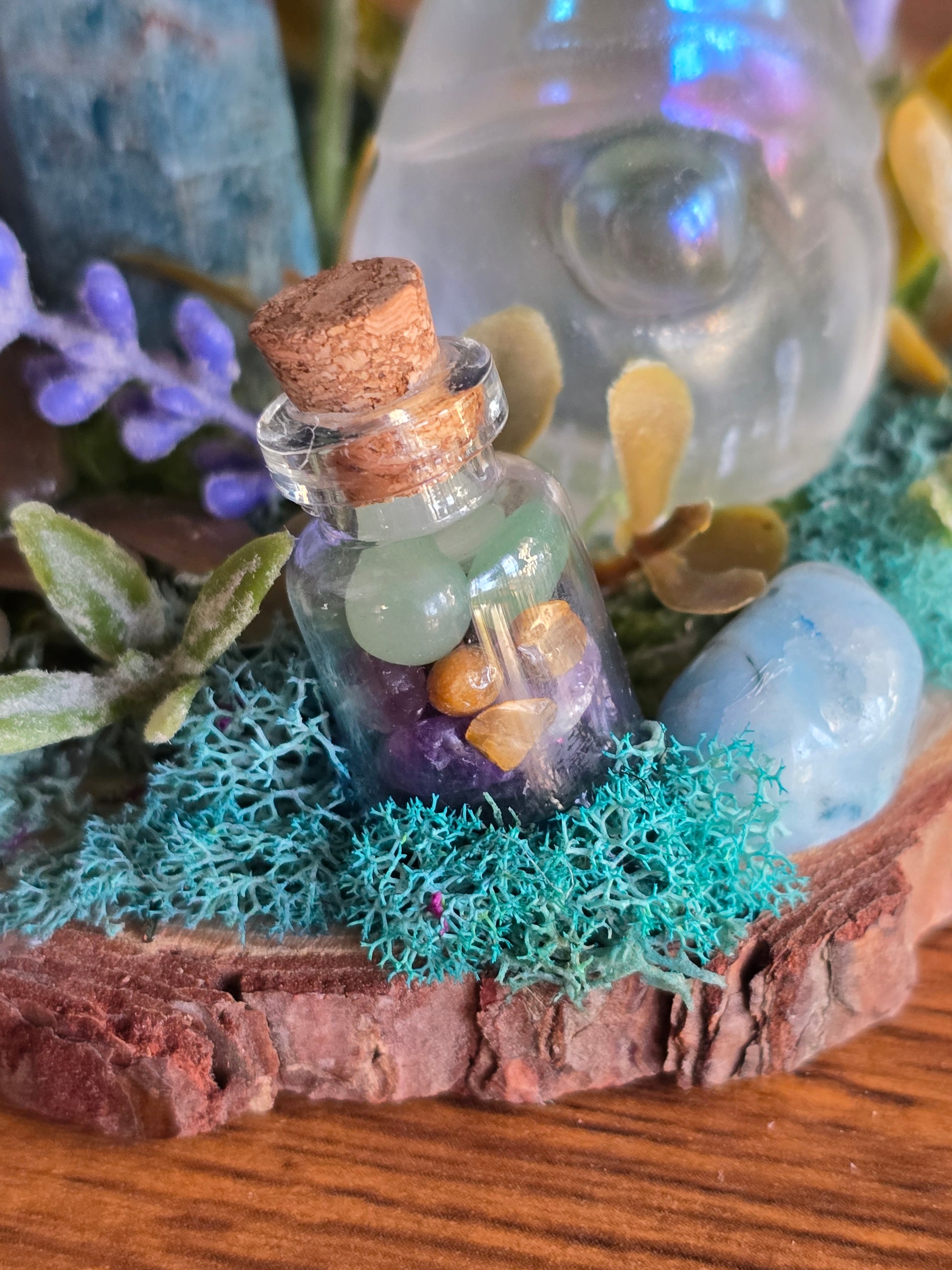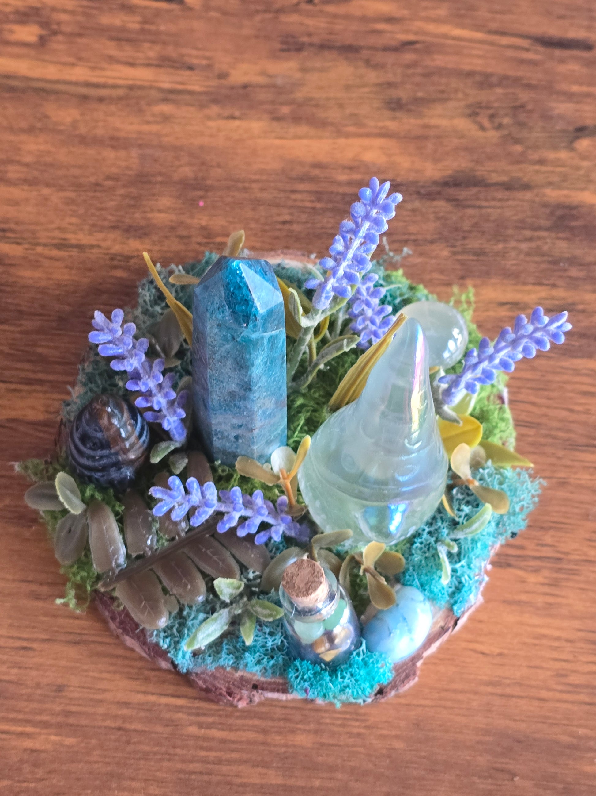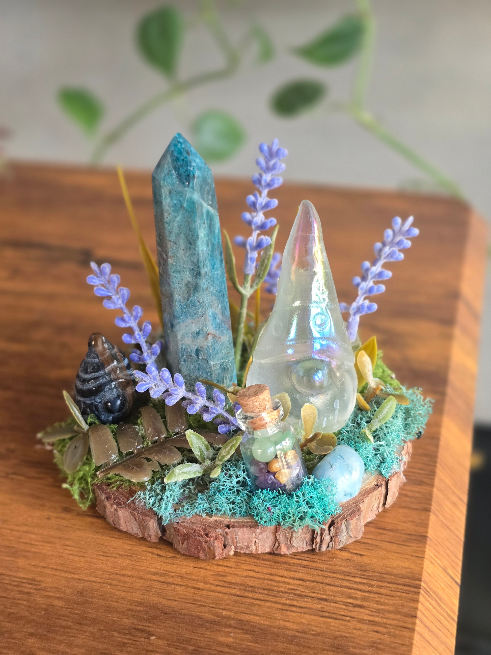 5" wood slice with faux moss and foilage. Featuring a gorgeous Aura Quartz Gnome, Apatite Tower, mini Tiger Eye Gnome and other genuine crystal accents.