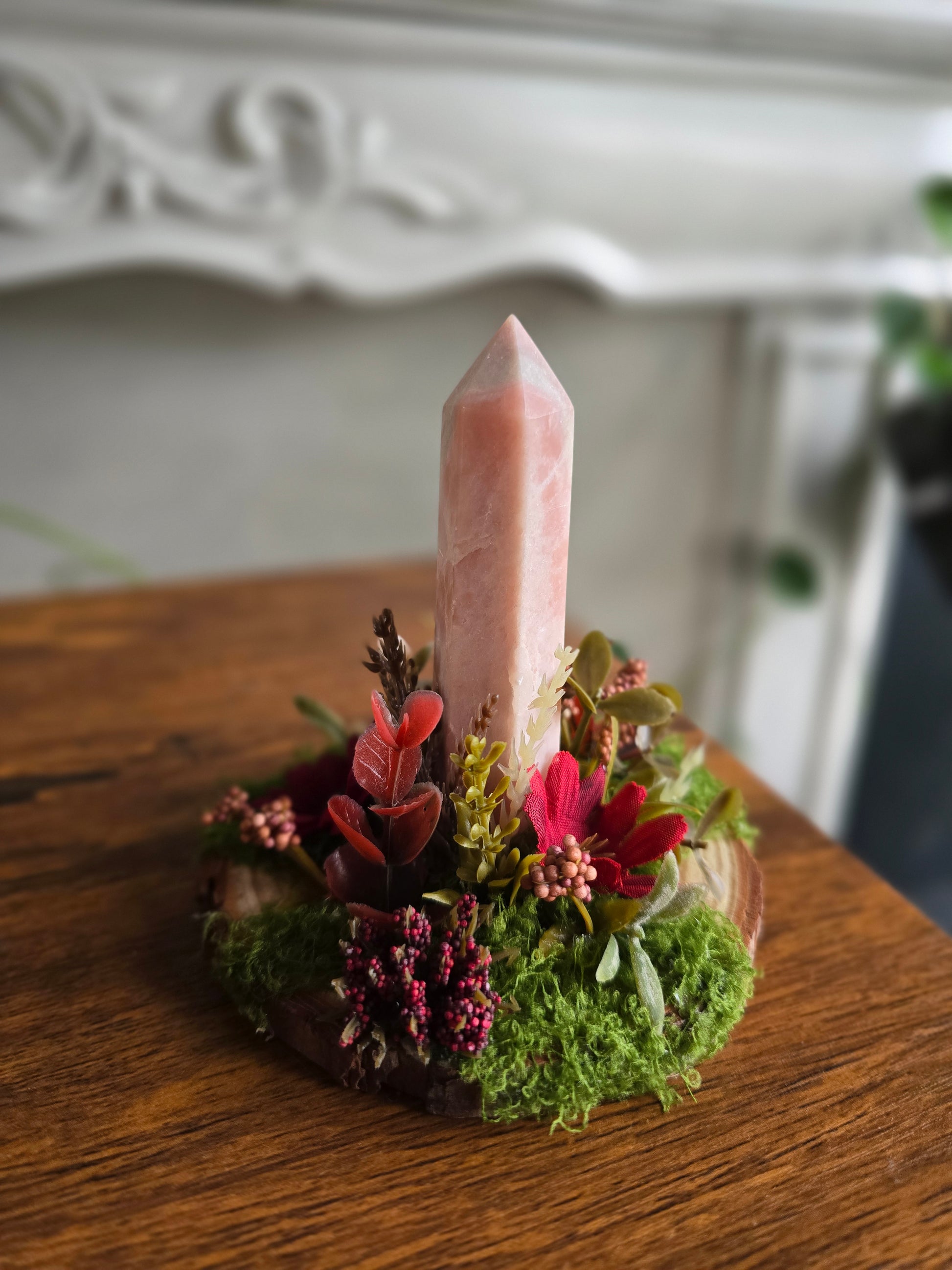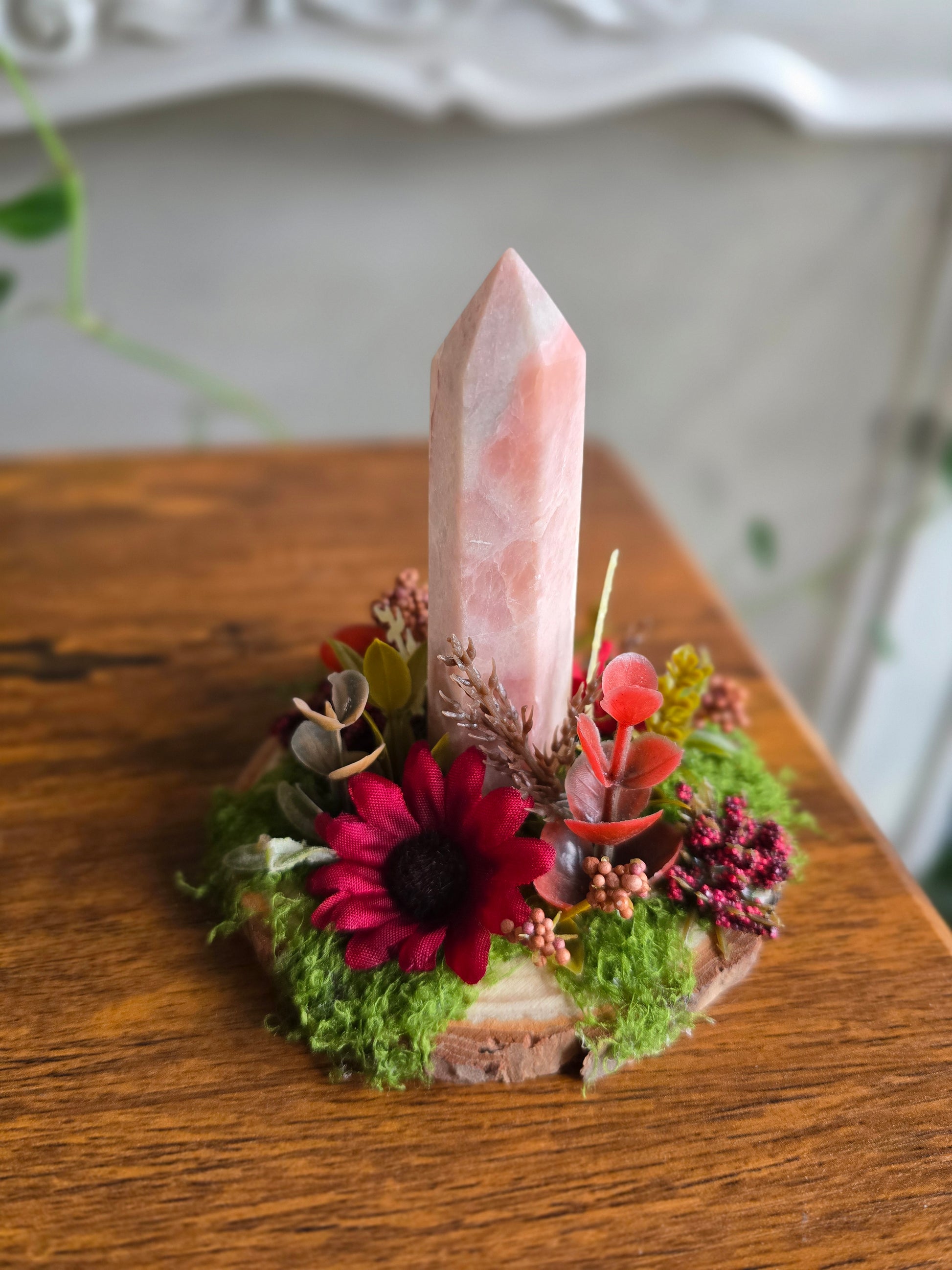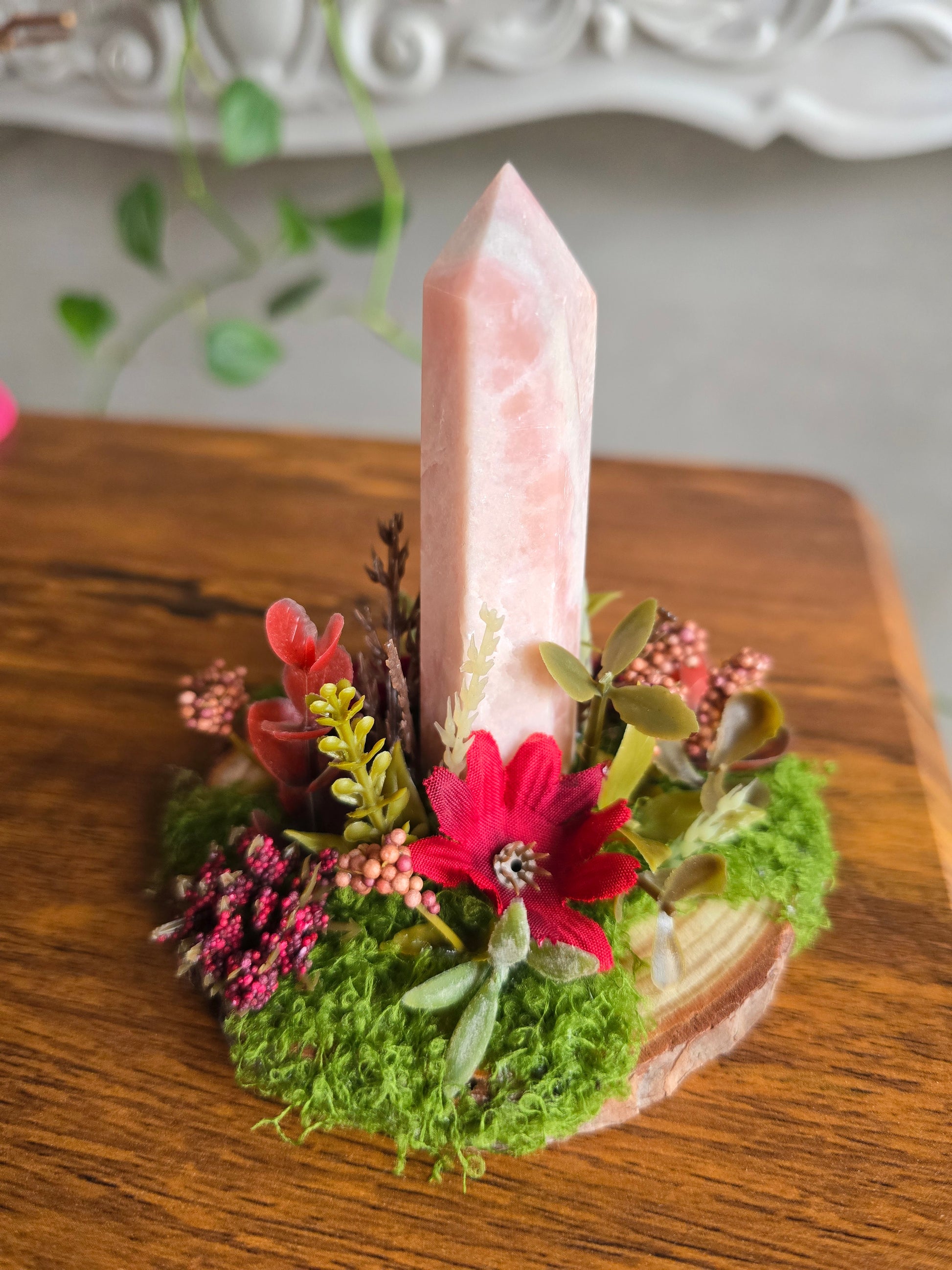 4" Pink Opal Tower on 5" wood slice with faux foilage.
