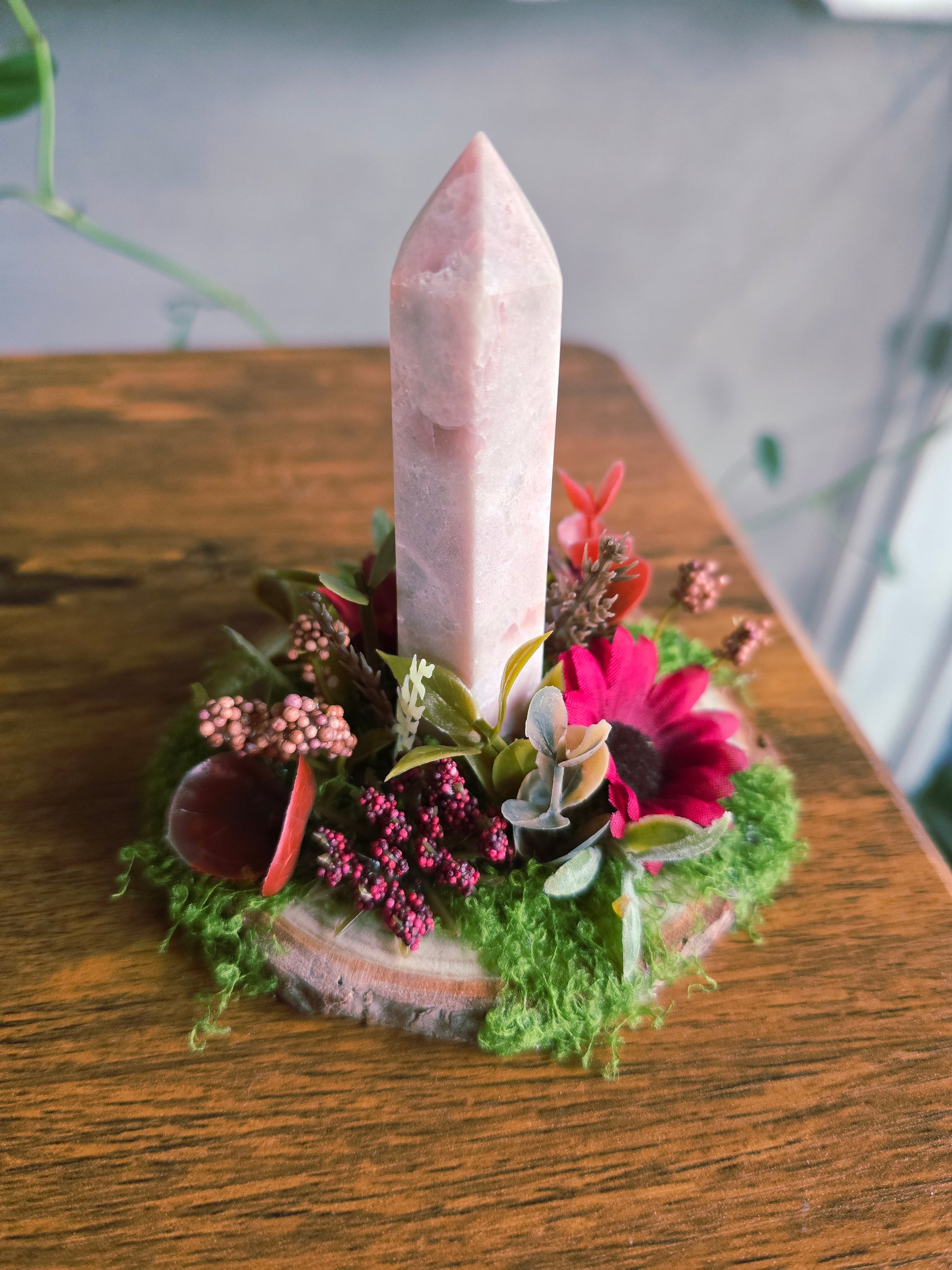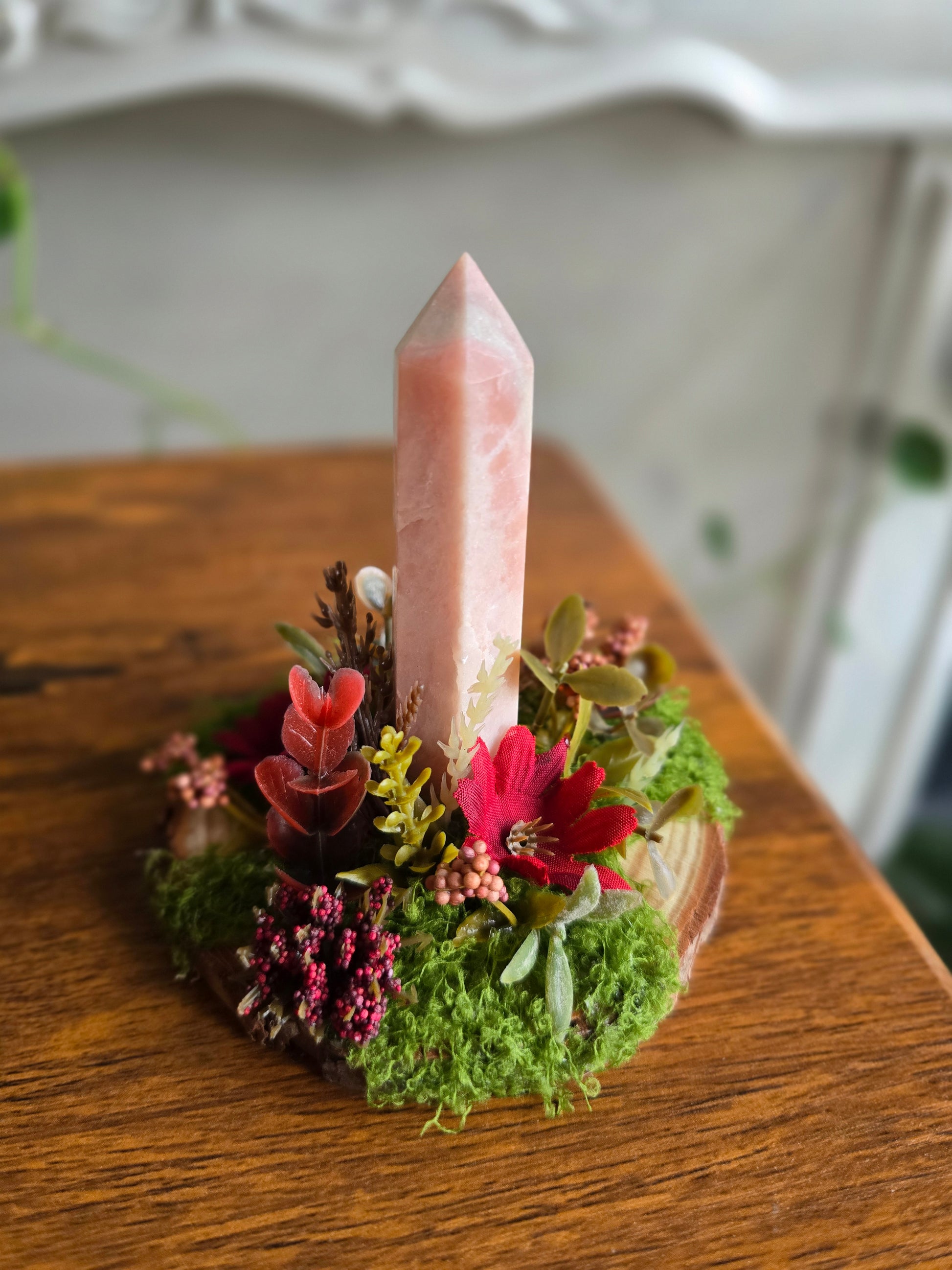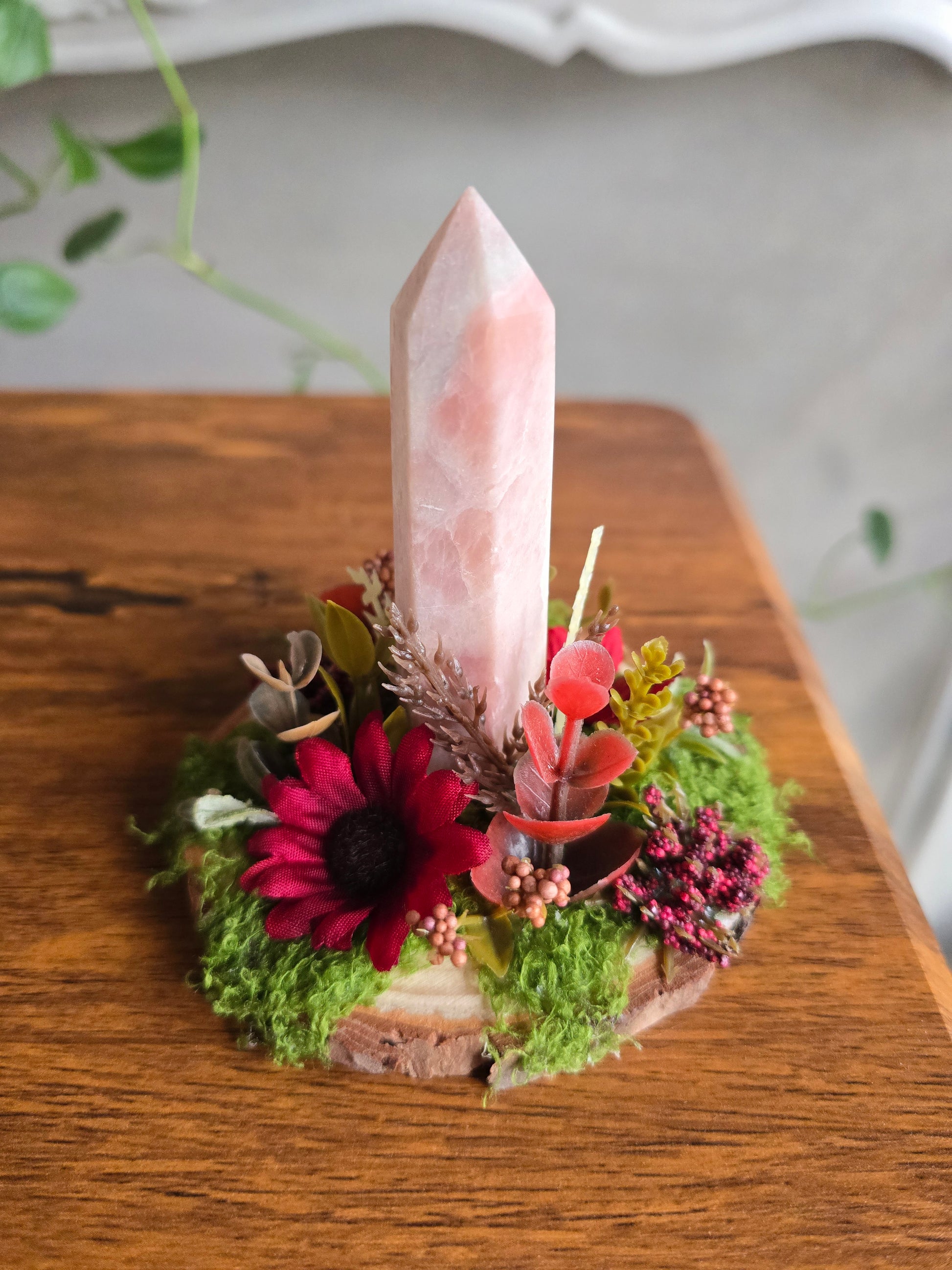 4" Pink Opal Tower on 5" wood slice with faux foilage.