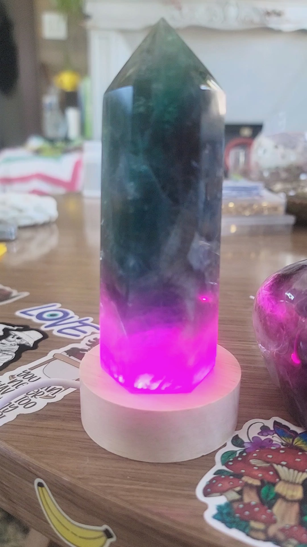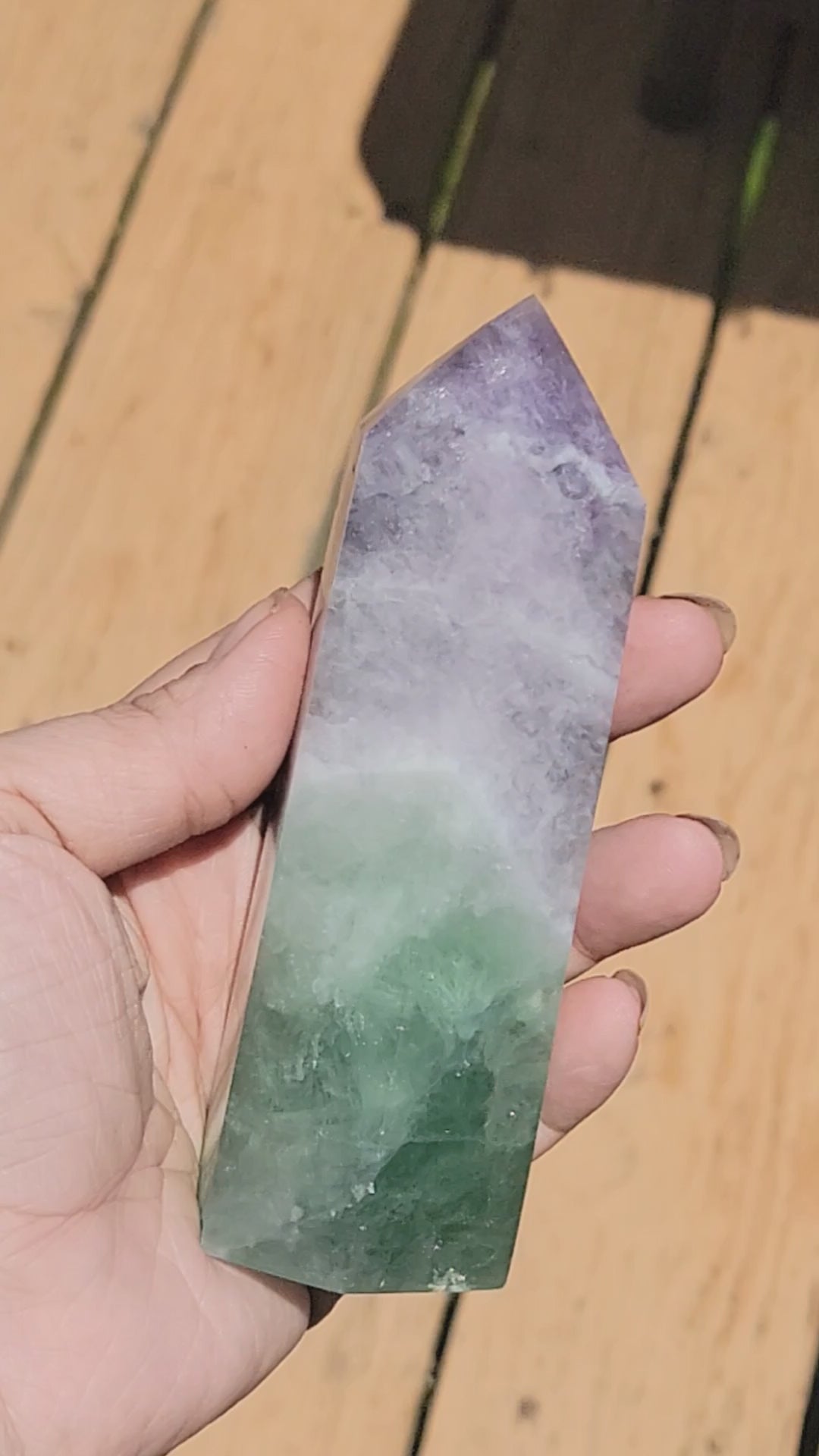 Beautify your space with this stunning Rainbow Fluorite tower. These gorgeous towers feature a unique pattern of green and purple colors with a crackle effect, adding a mesmerizing texture to the natural form.
