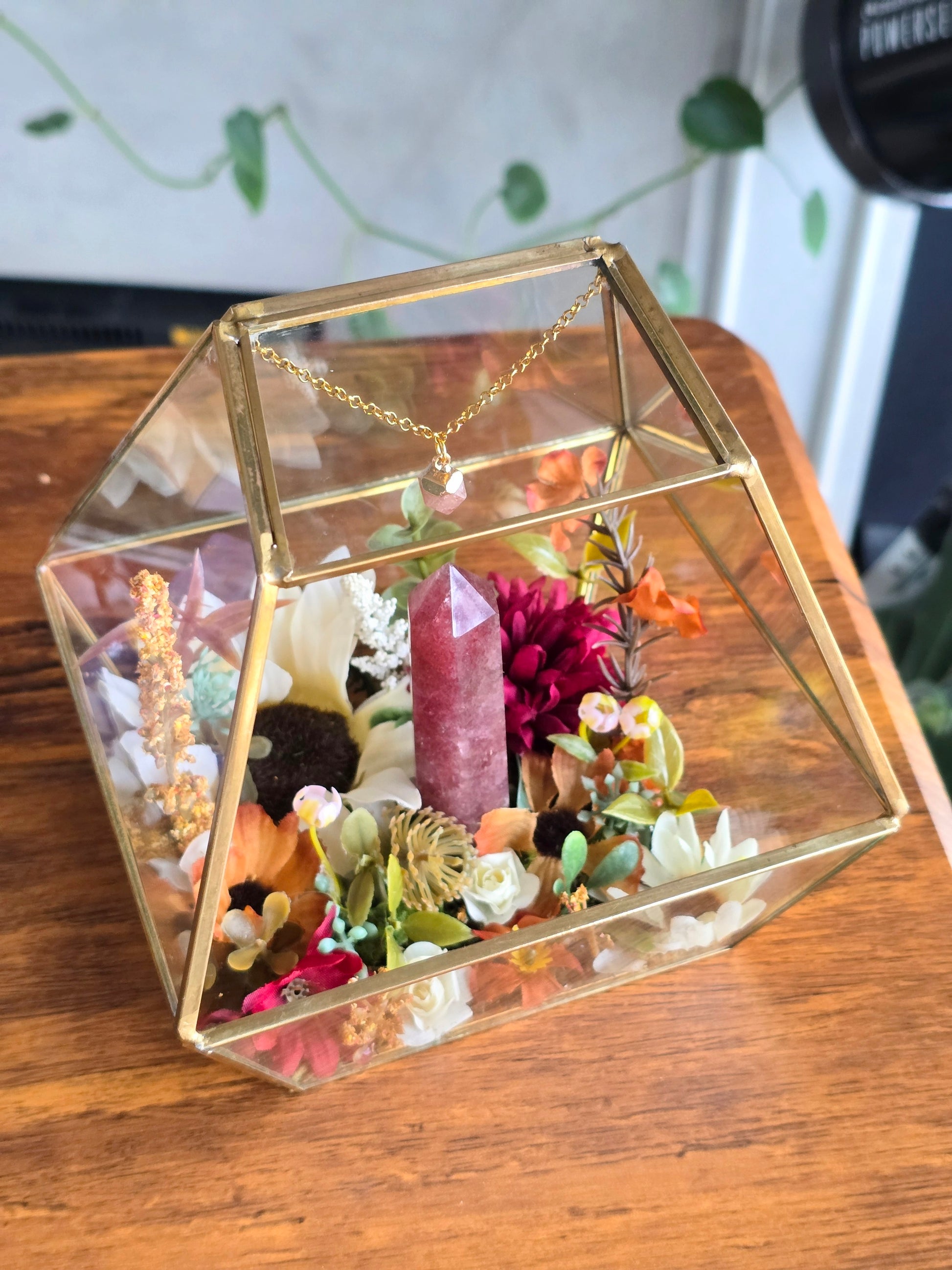 ✨️ Glass terrarium with faux moss, foilage, Strawberry Quartz tower and hanging pendant.