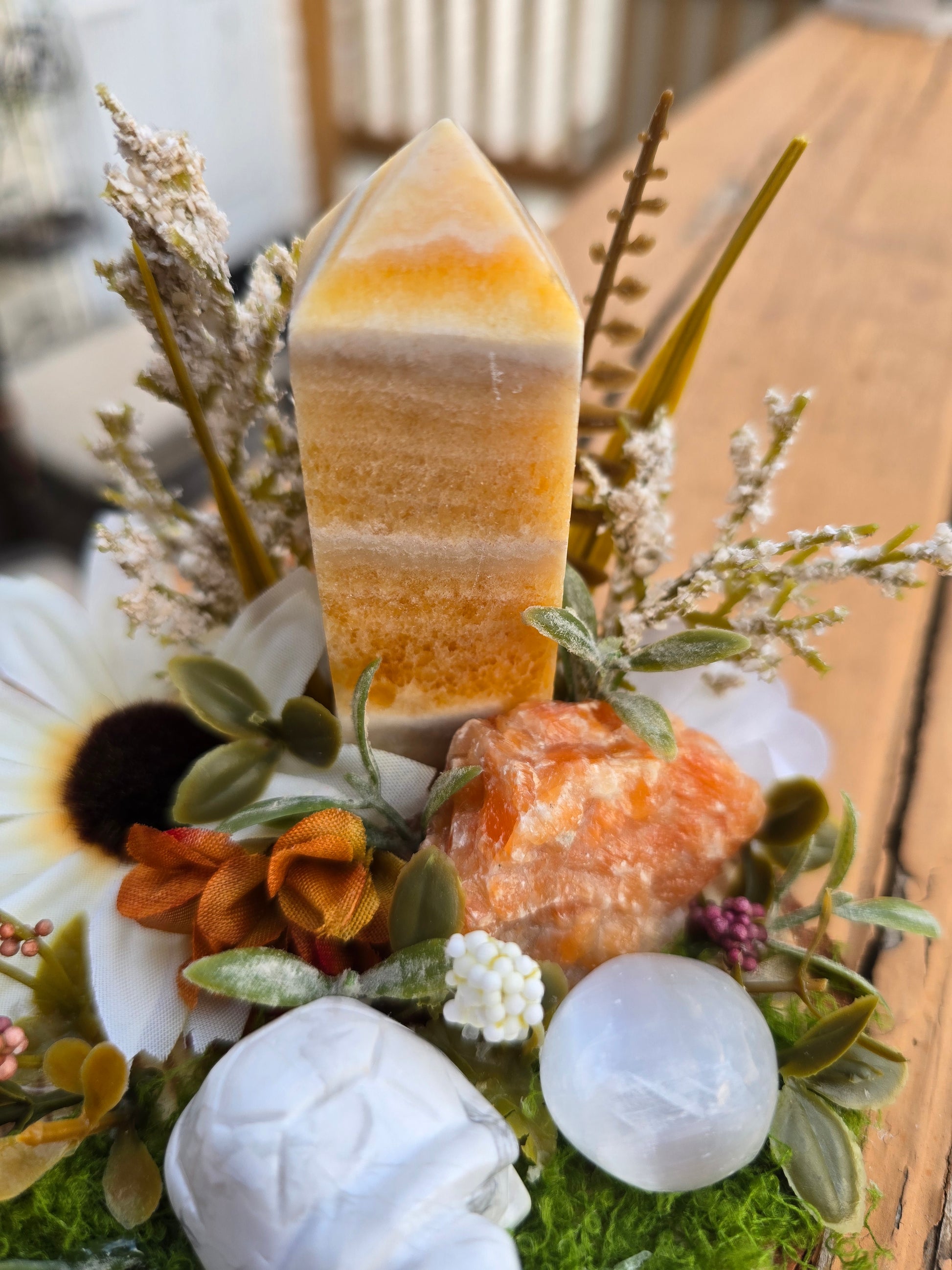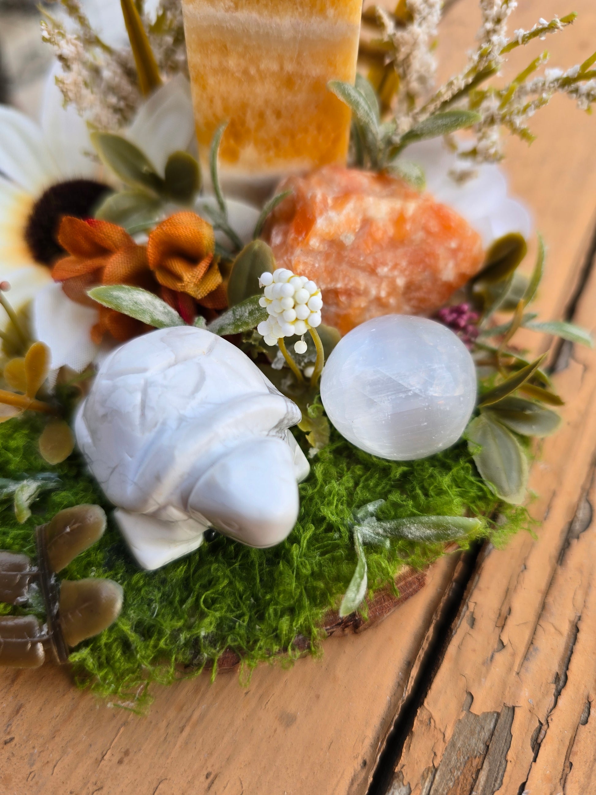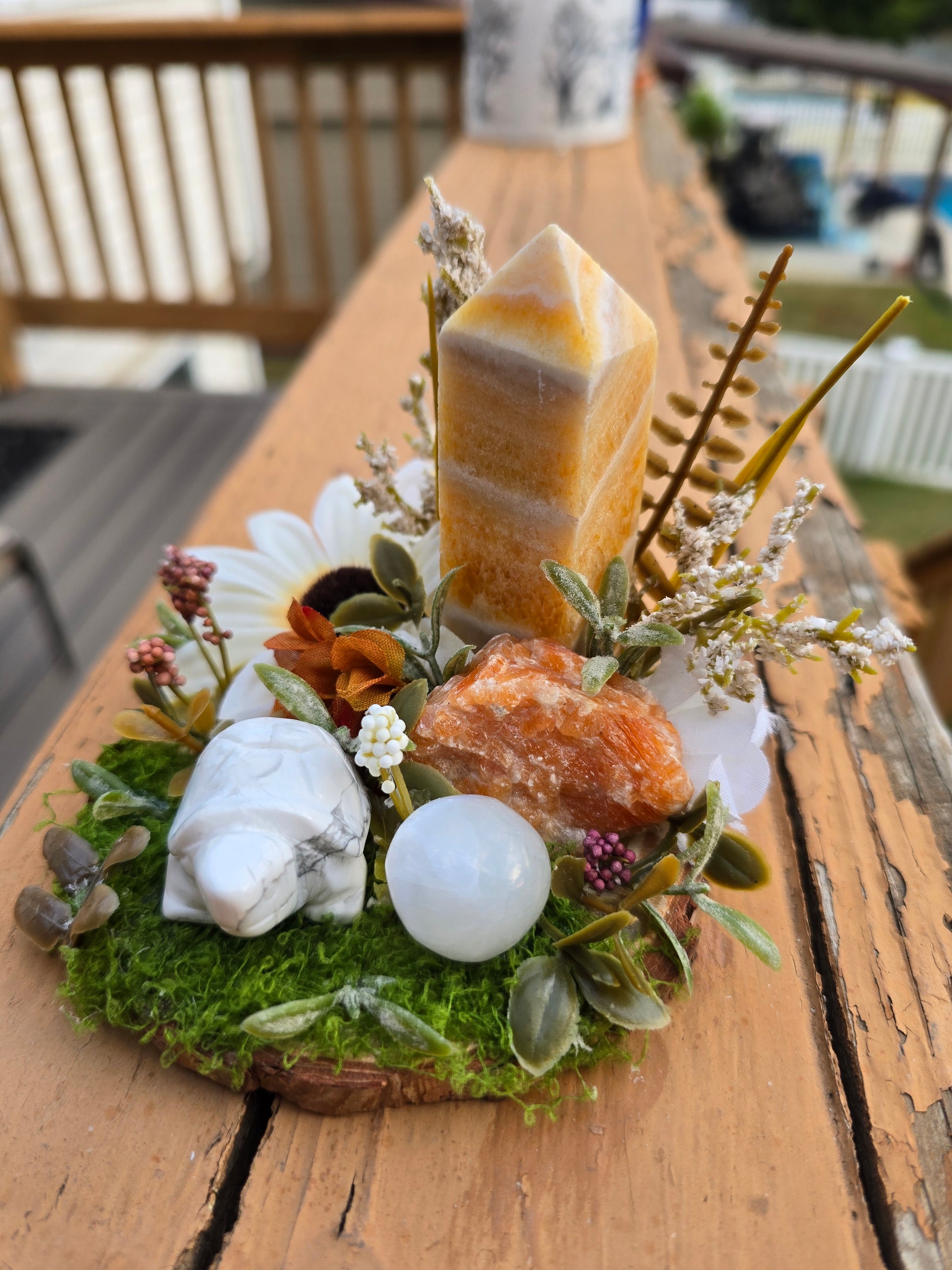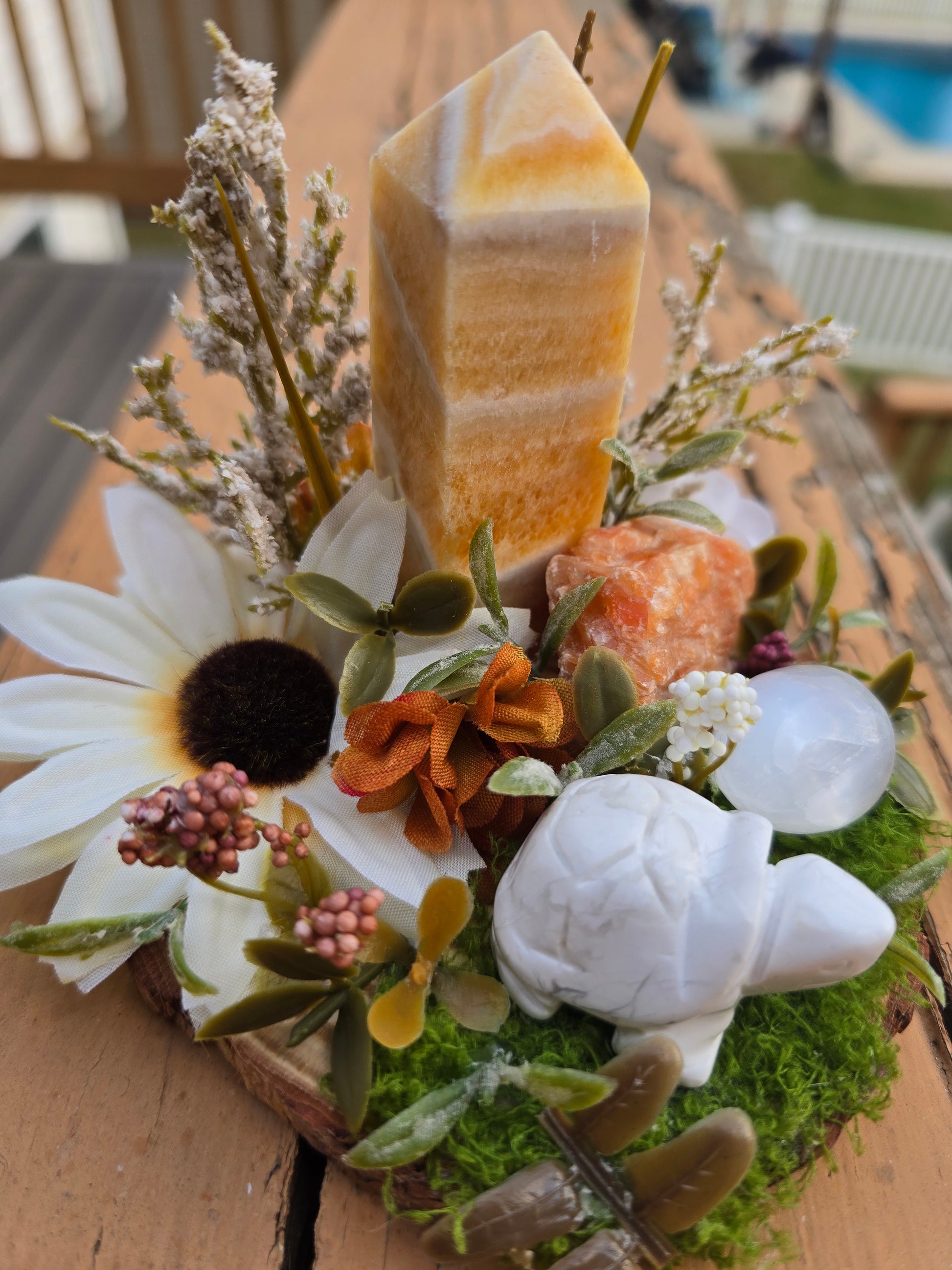 5" wood slice with 3.25" Honey Banded Calcite tower, raw Sunstone chunk, Howlite Turtle carving, small Selenite sphere, and faux foliage.
