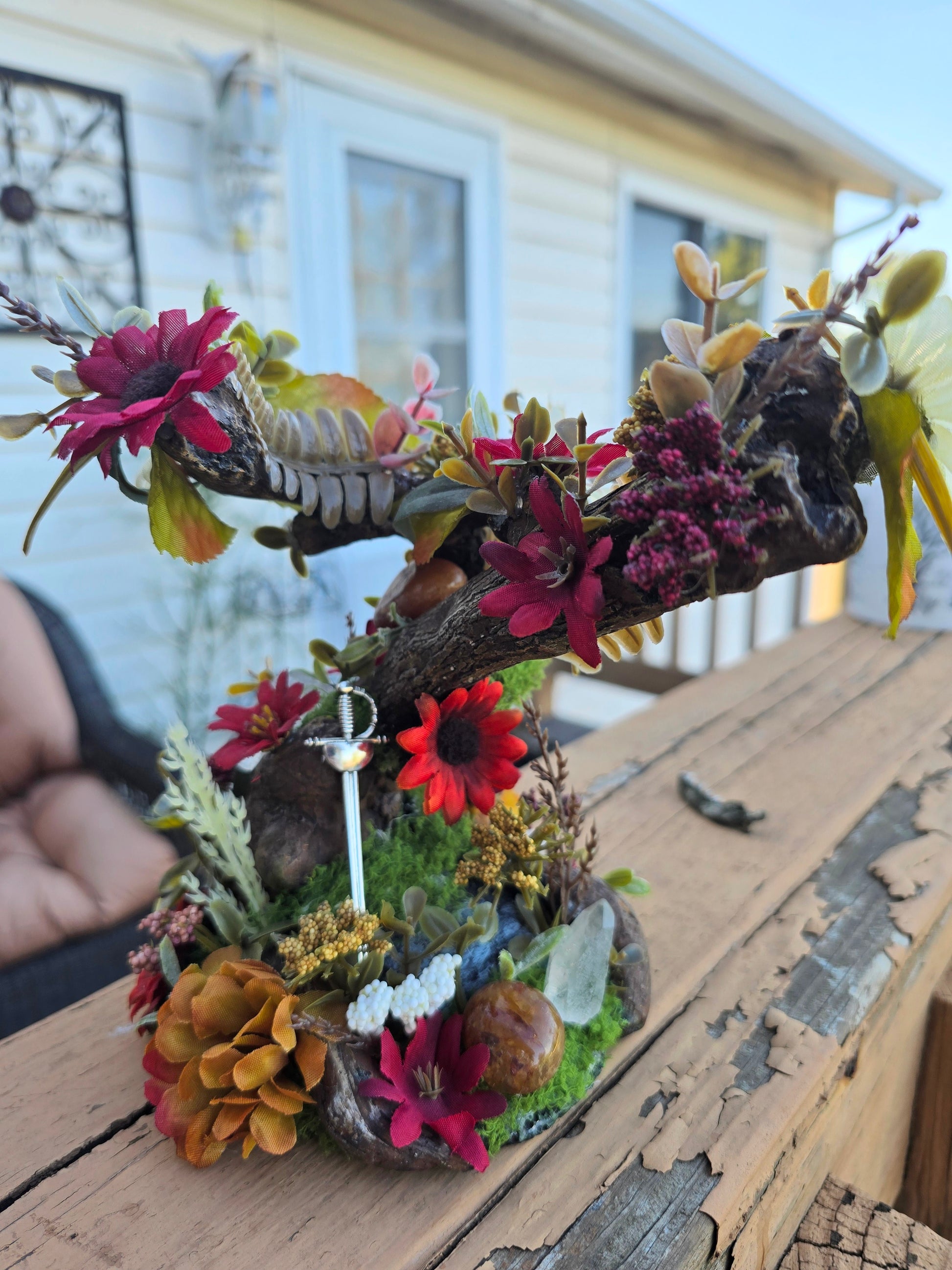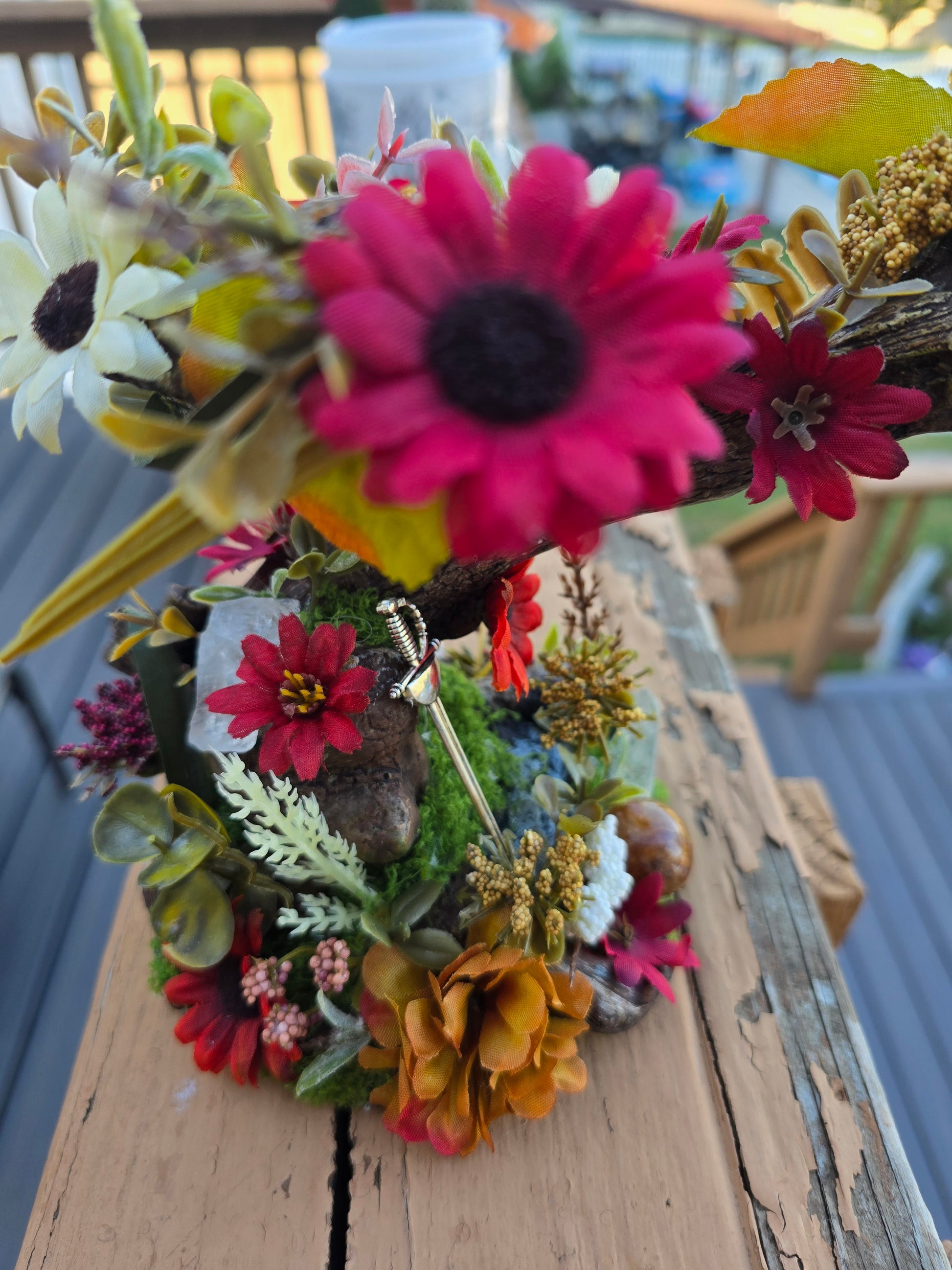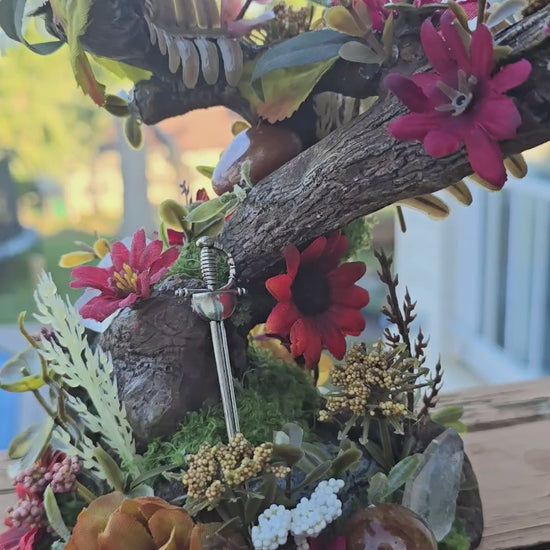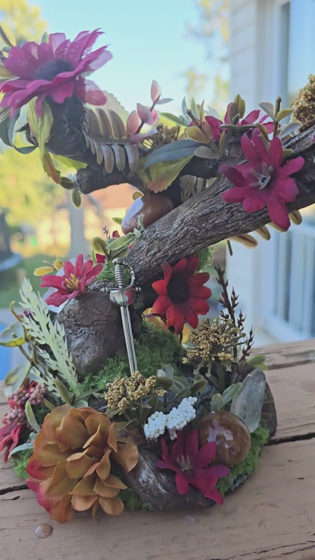 Made of sturdy resin. Adorned with faux foilage, alloy sword charm, Carnelian tumbles and Clear Quartz points.