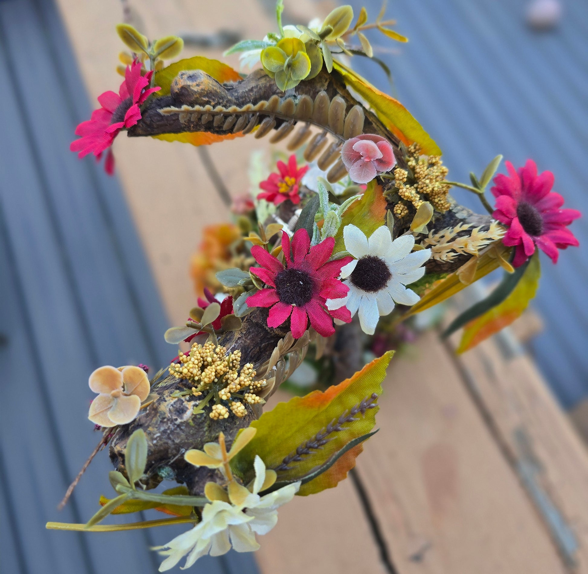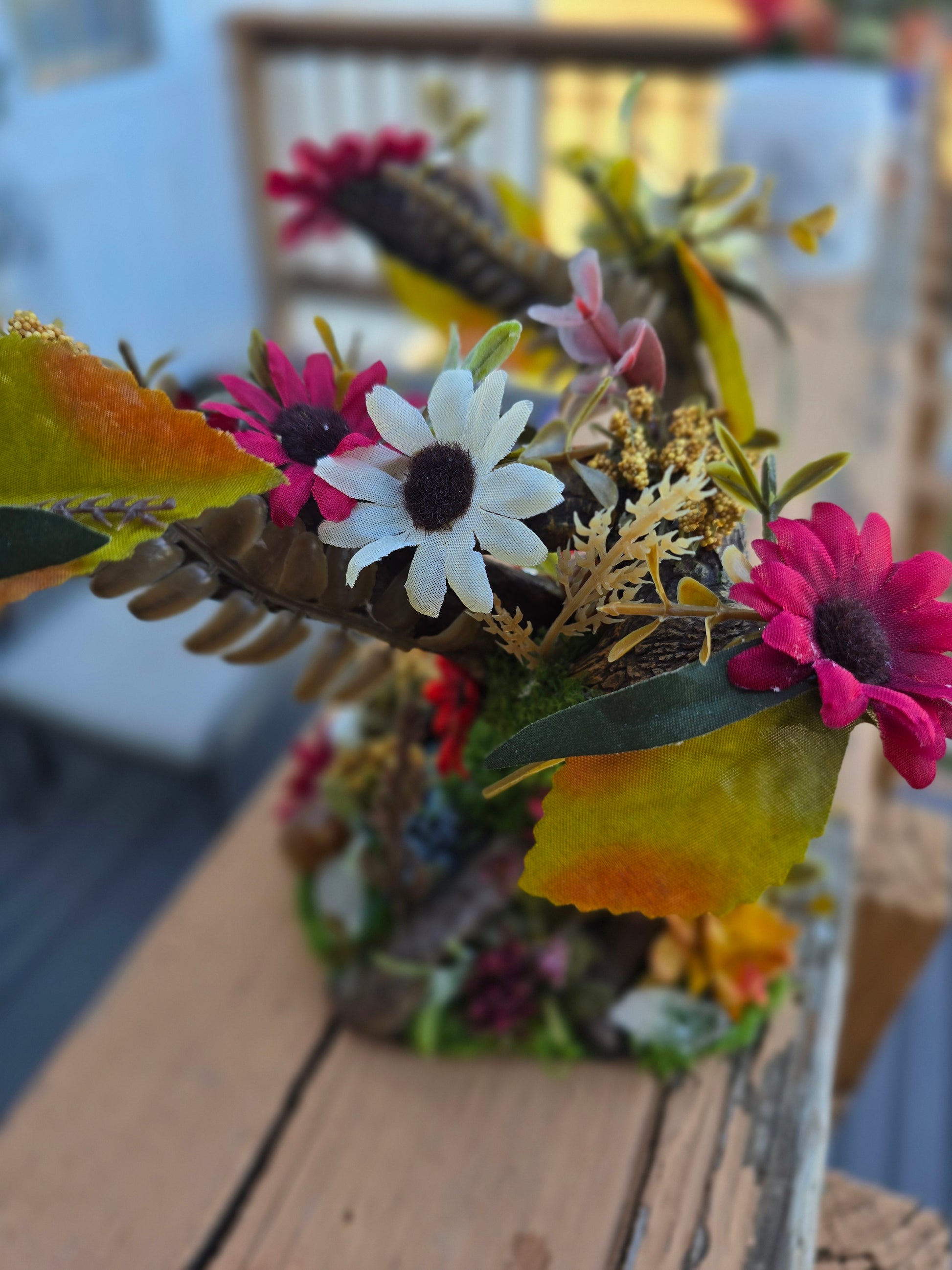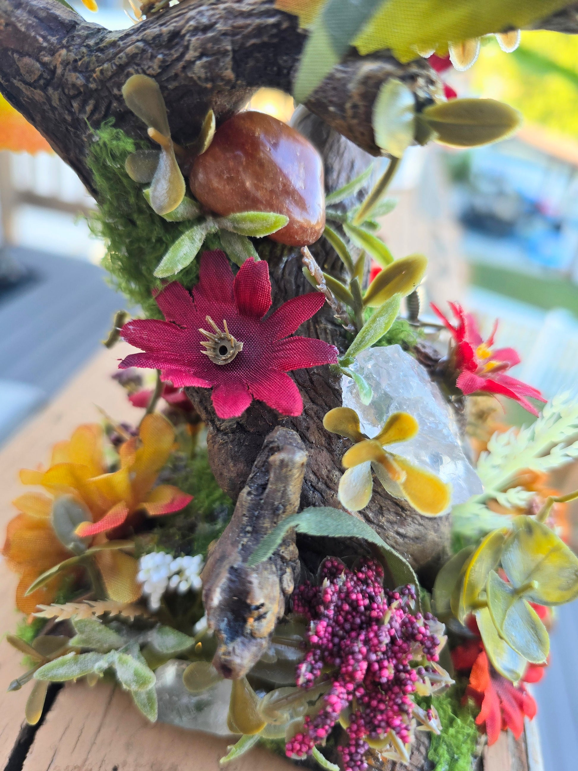 Made of sturdy resin. Adorned with faux foilage, alloy sword charm, Carnelian tumbles and Clear Quartz points.