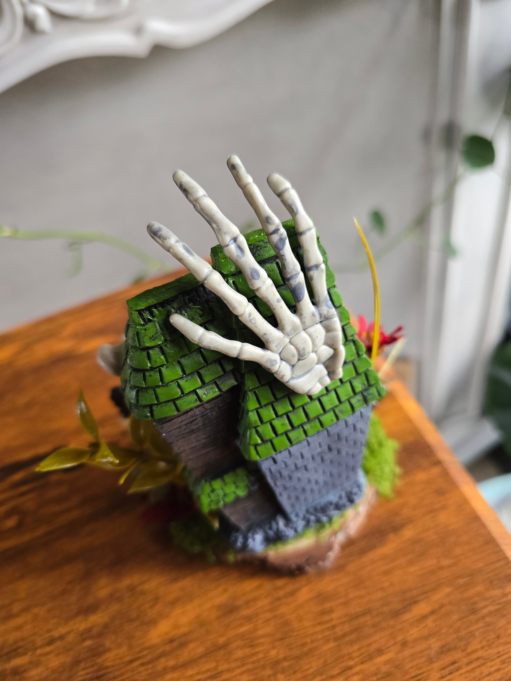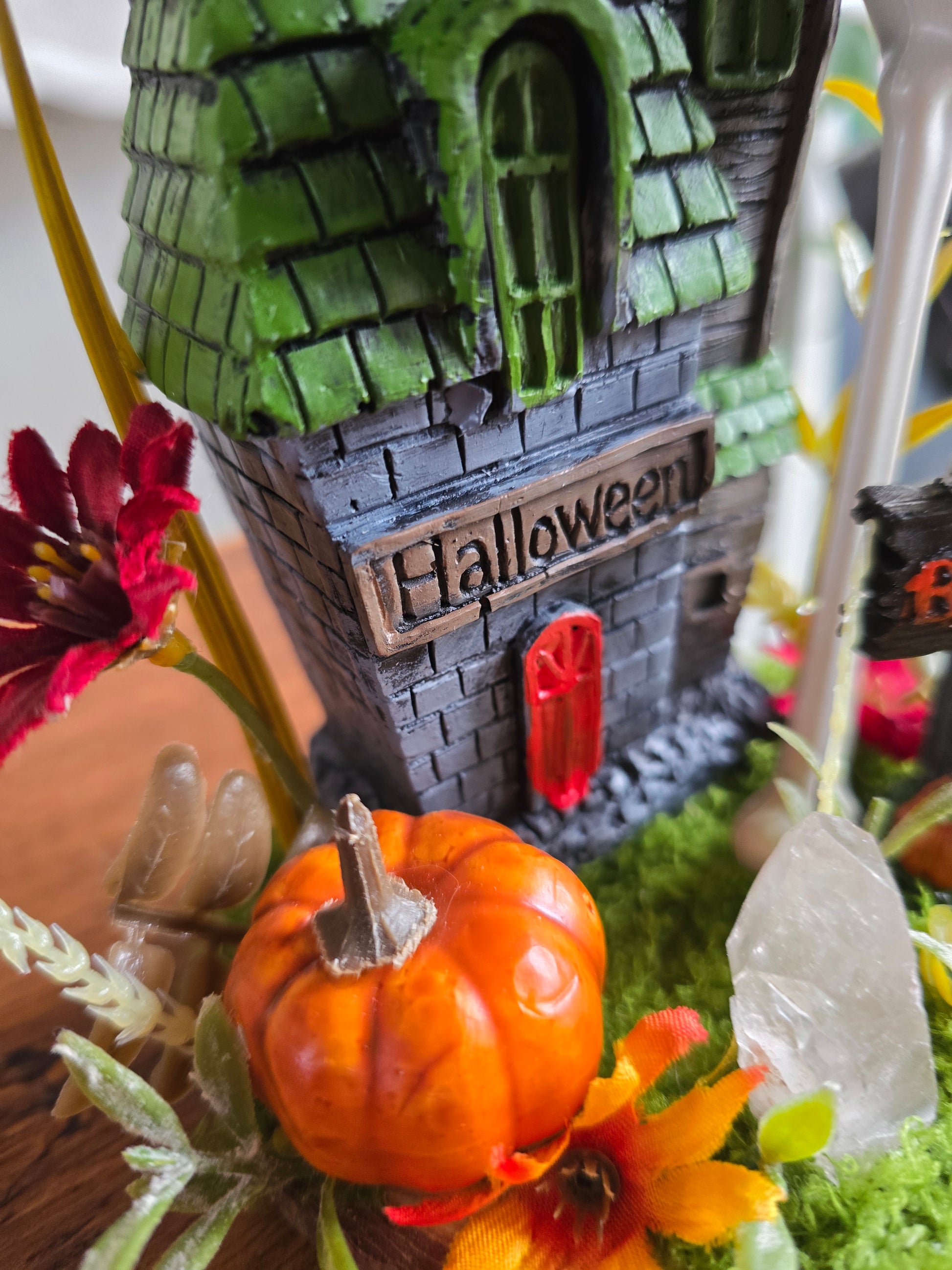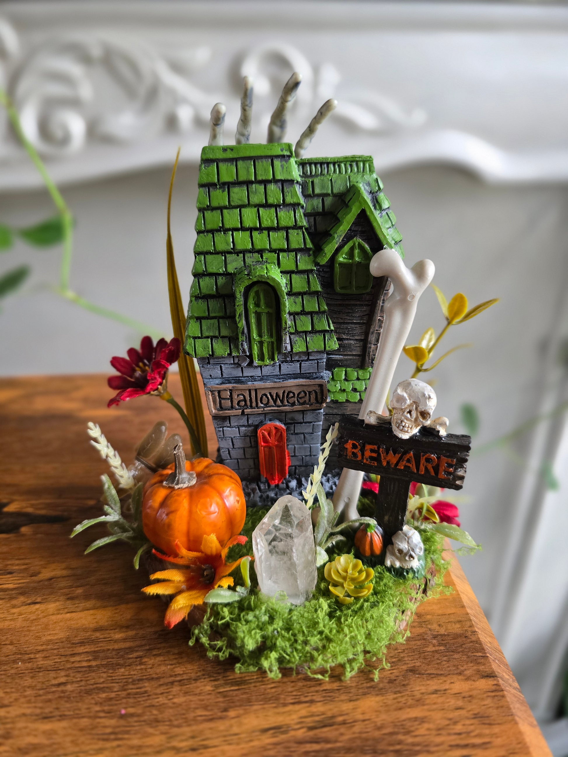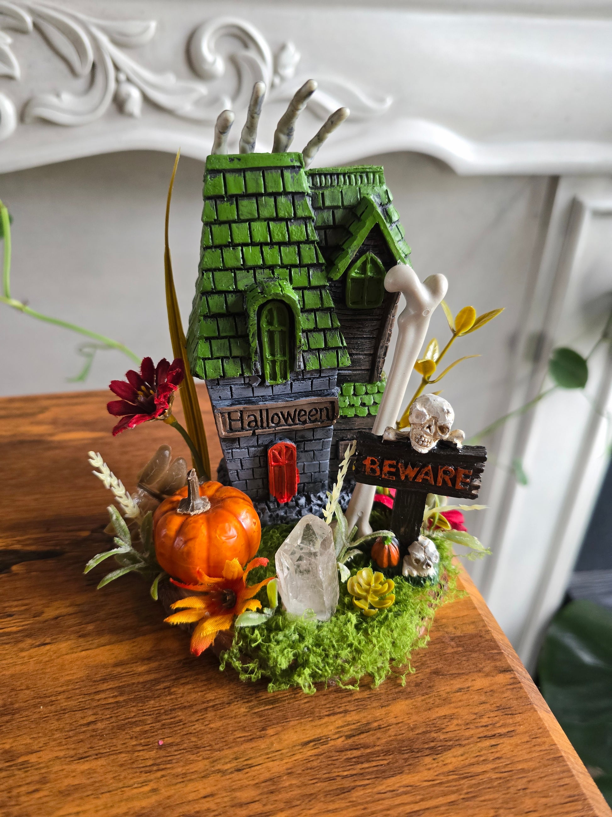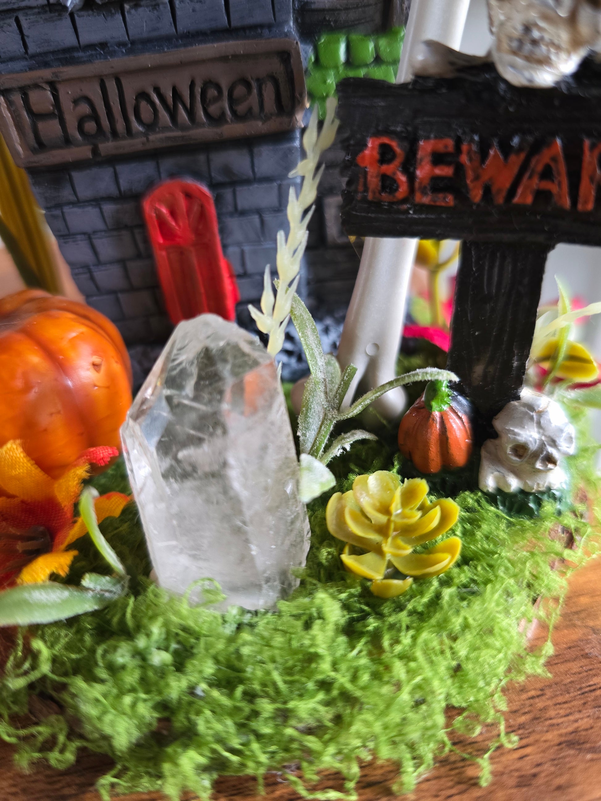 Little resin cast figureswith faux pumpkin, bones, moss, and foilage with a clear quartz point. The perfect little shelf buddy.