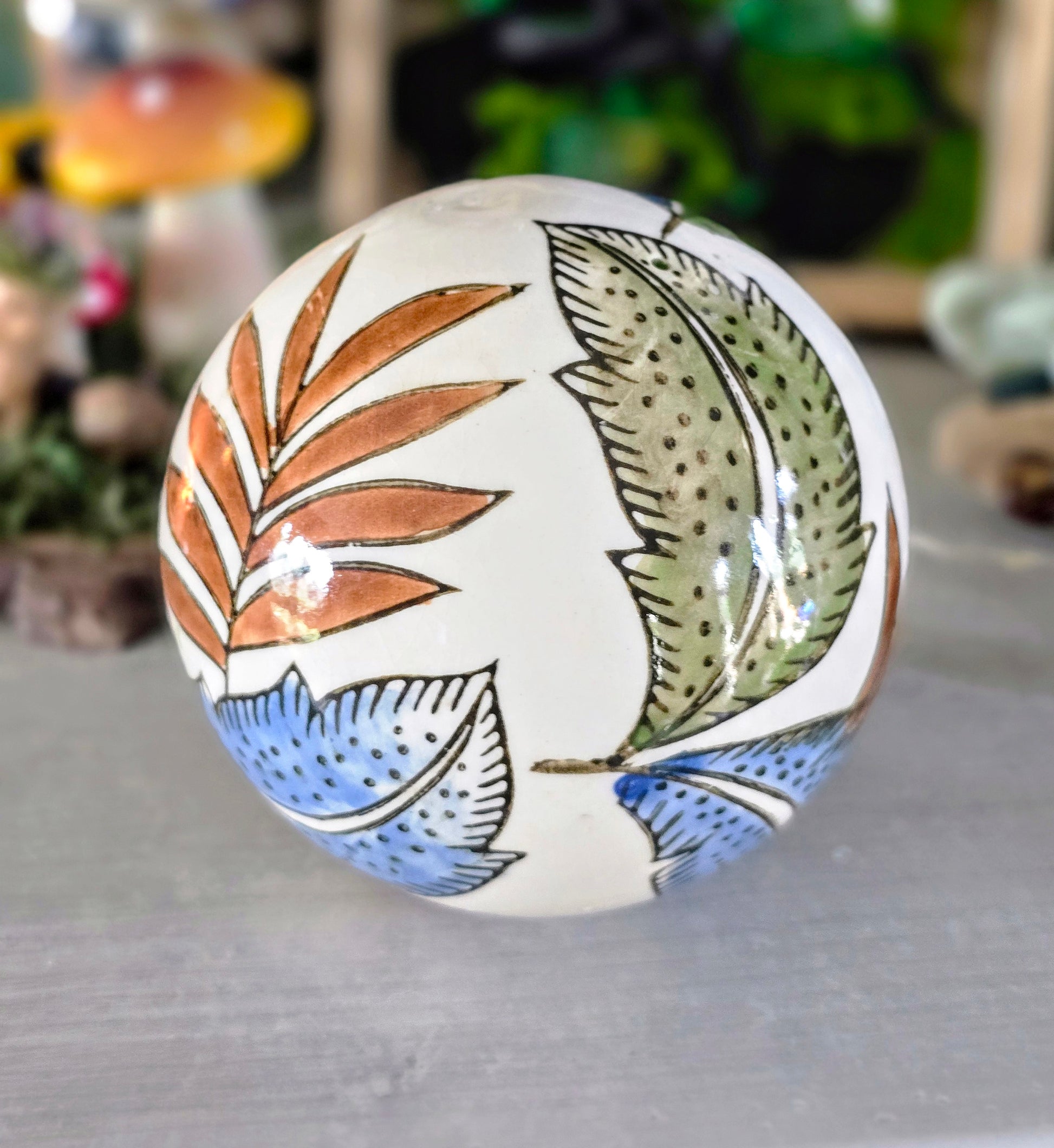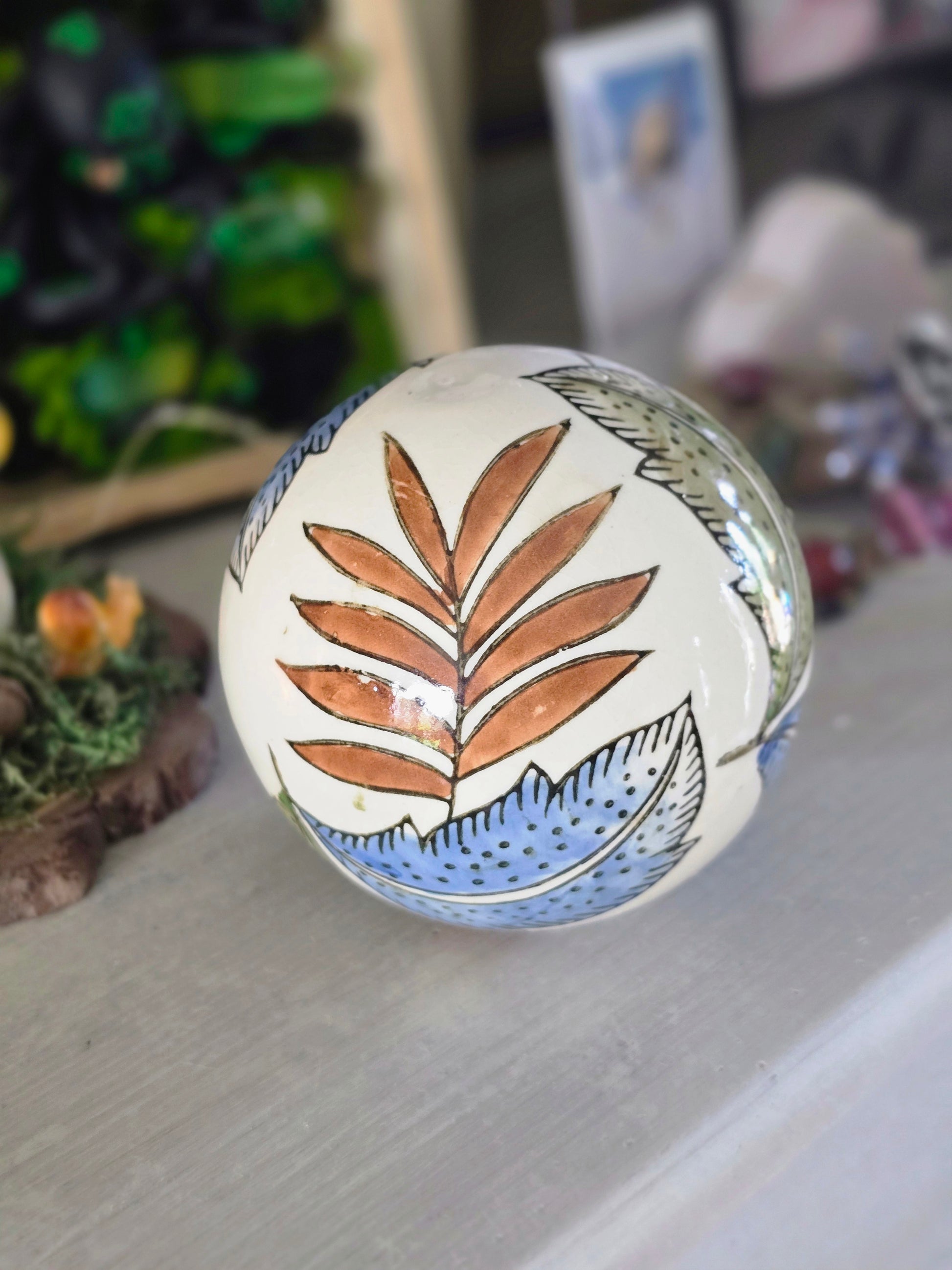 This vintage 3" ceramic ball features an etched and painted design, adding a touch of elegance to any space. Perfect for collectors or as a unique decorative piece, this ball is sure to impress.