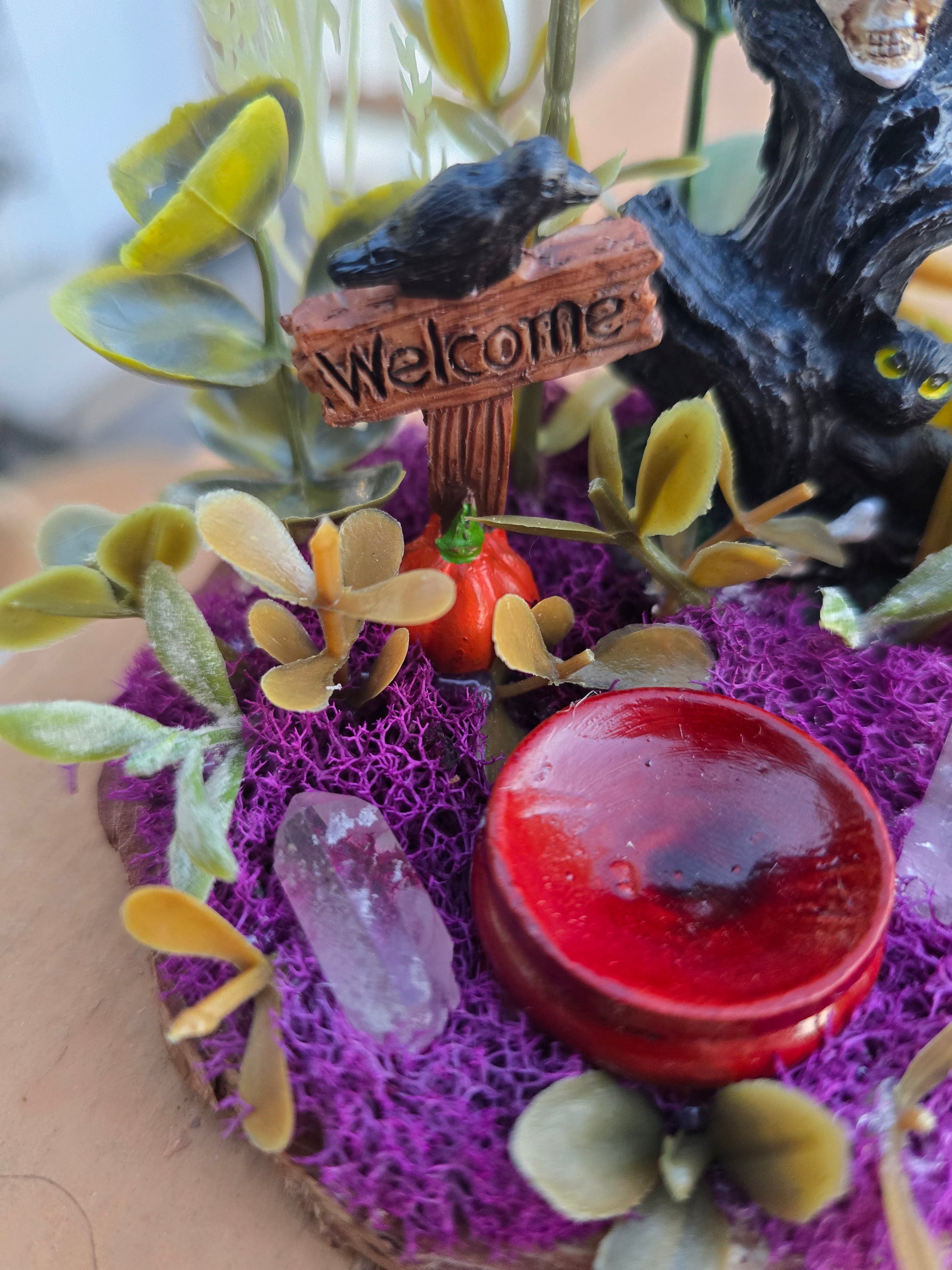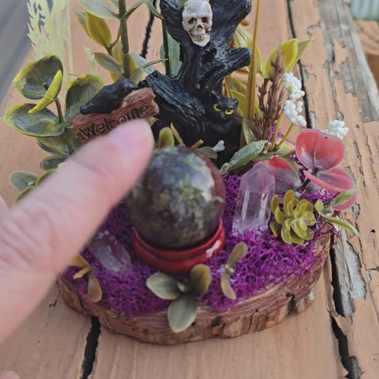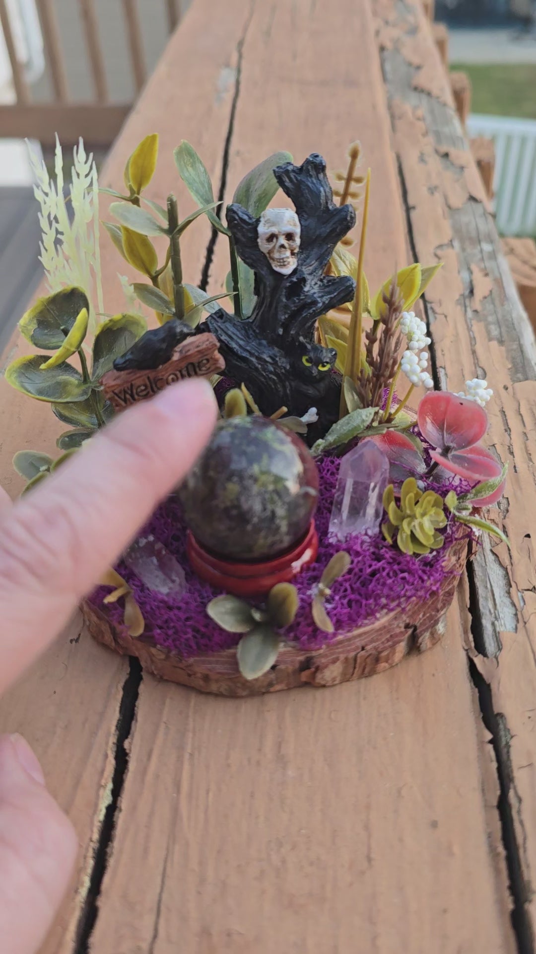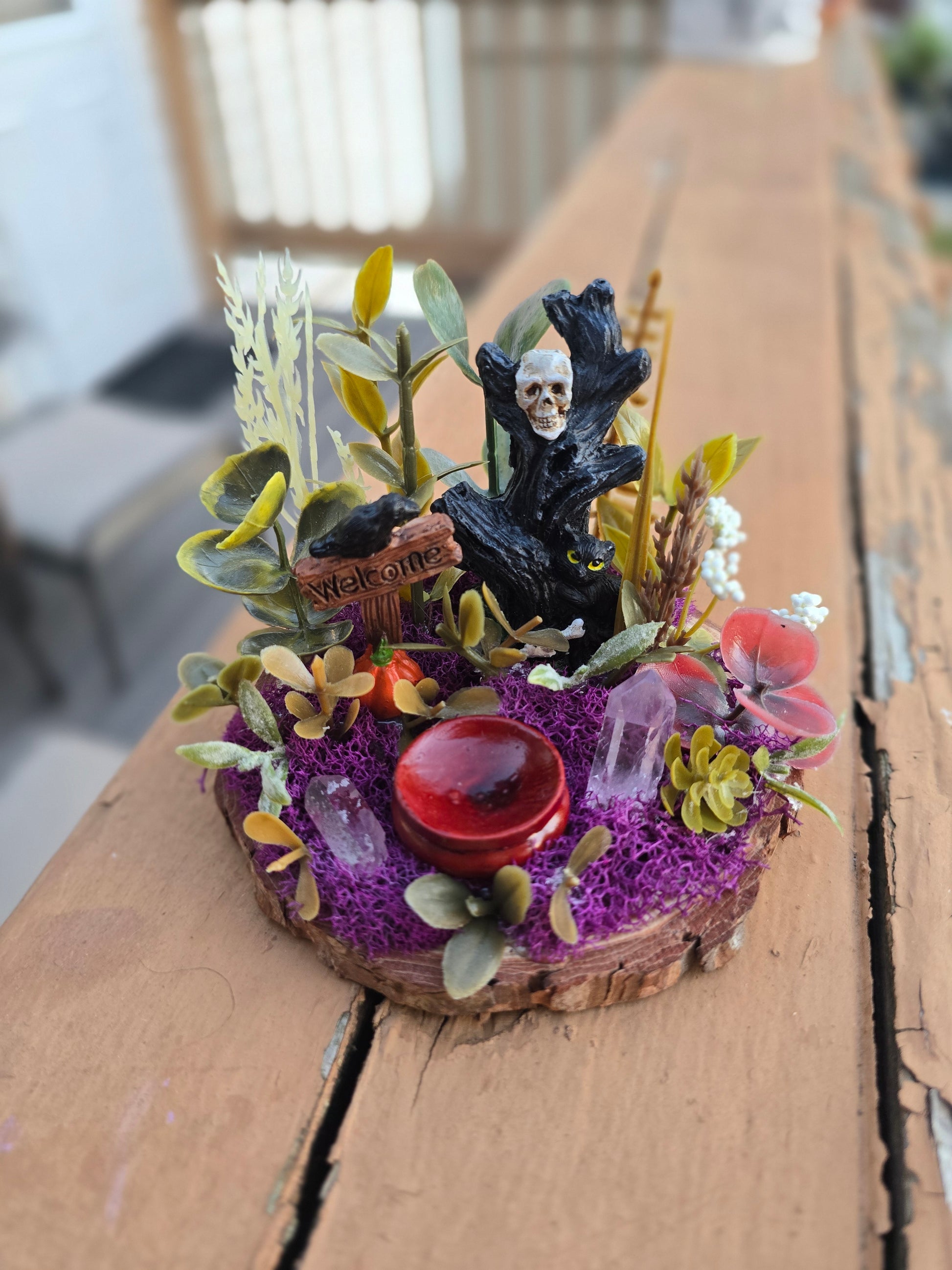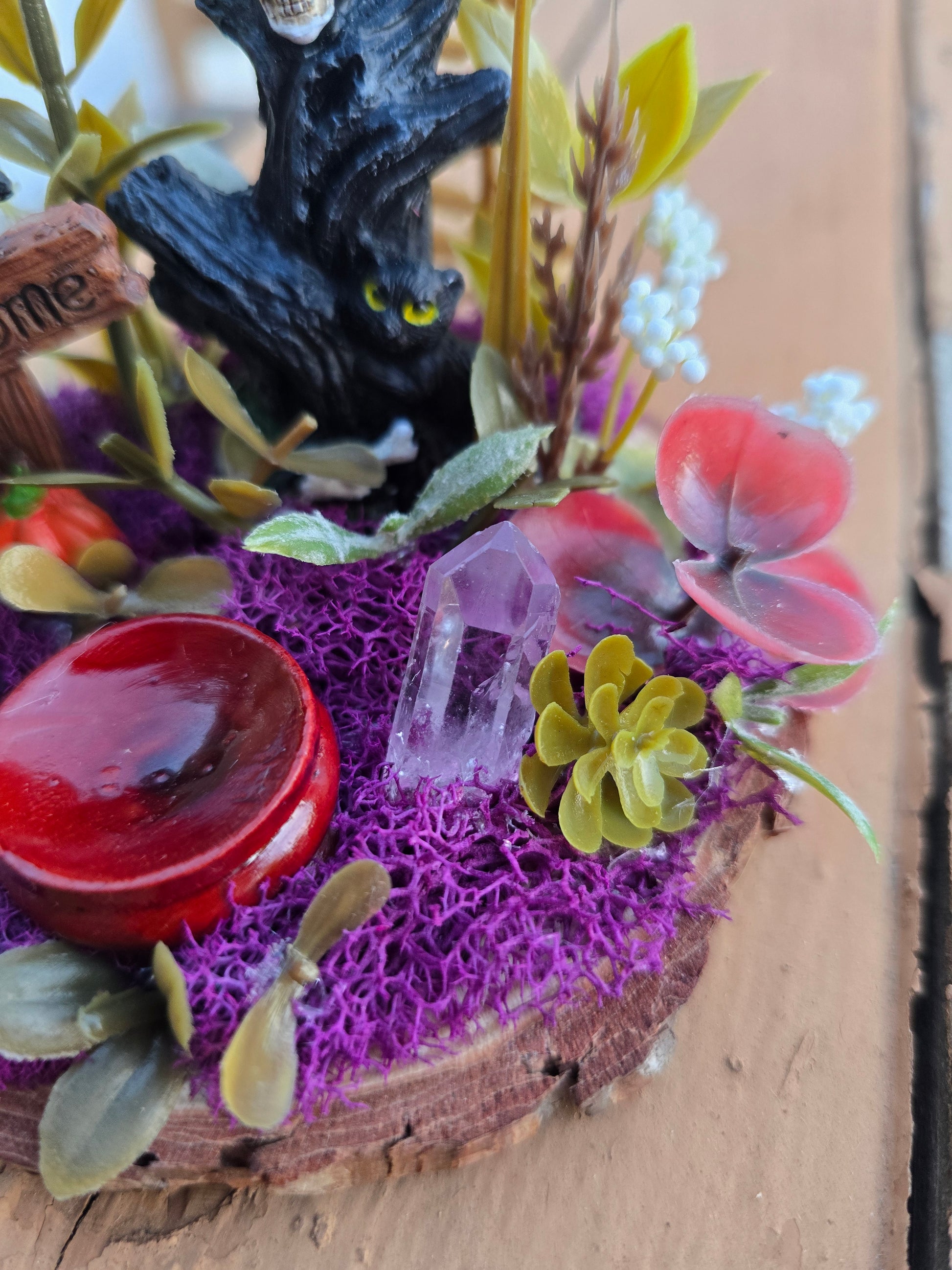5" wood slice with faux moss, foilage, and Clear Quartz points.