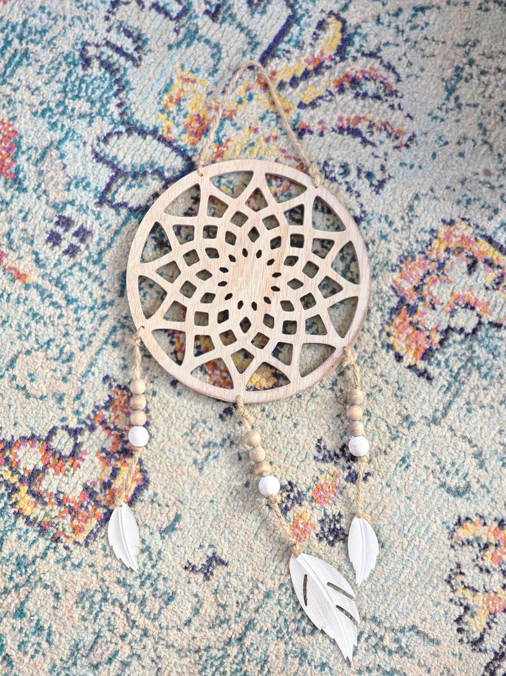 This Wooden Dreamcatcher features metal feathers and wooden beads, allowing for a neutral design that can be personalized with your own creative touch. Add some paint or glue on embellishments to make it truly unique. Sweet dreams with a relaxed vibe.